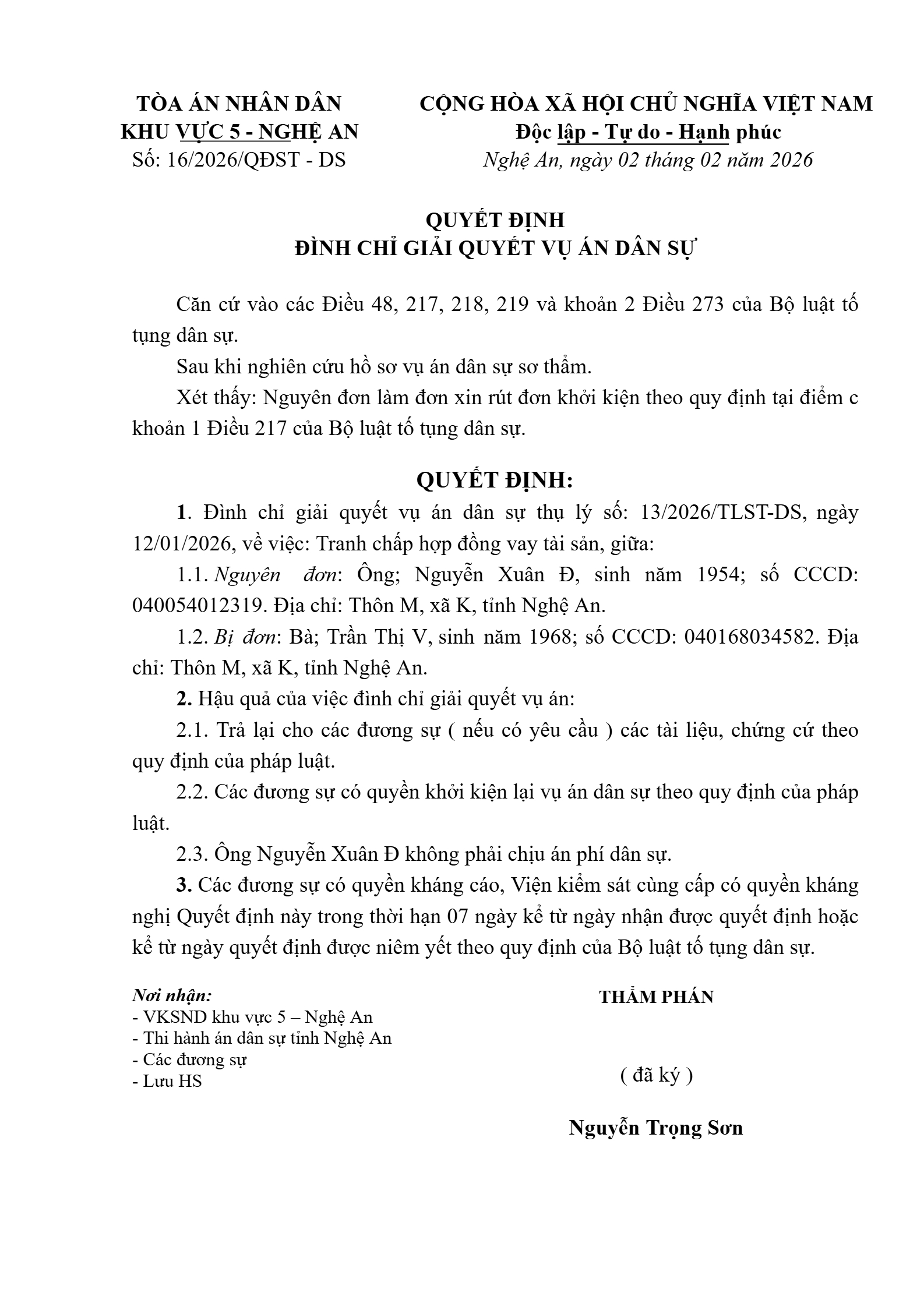 Quyết định số 16/2026/QĐST-DS ngày 02/02/2026 của Tòa án nhân dân khu vực 5 - Nghệ An, tỉnh Nghệ An về tranh chấp hợp đồng vay tài sản