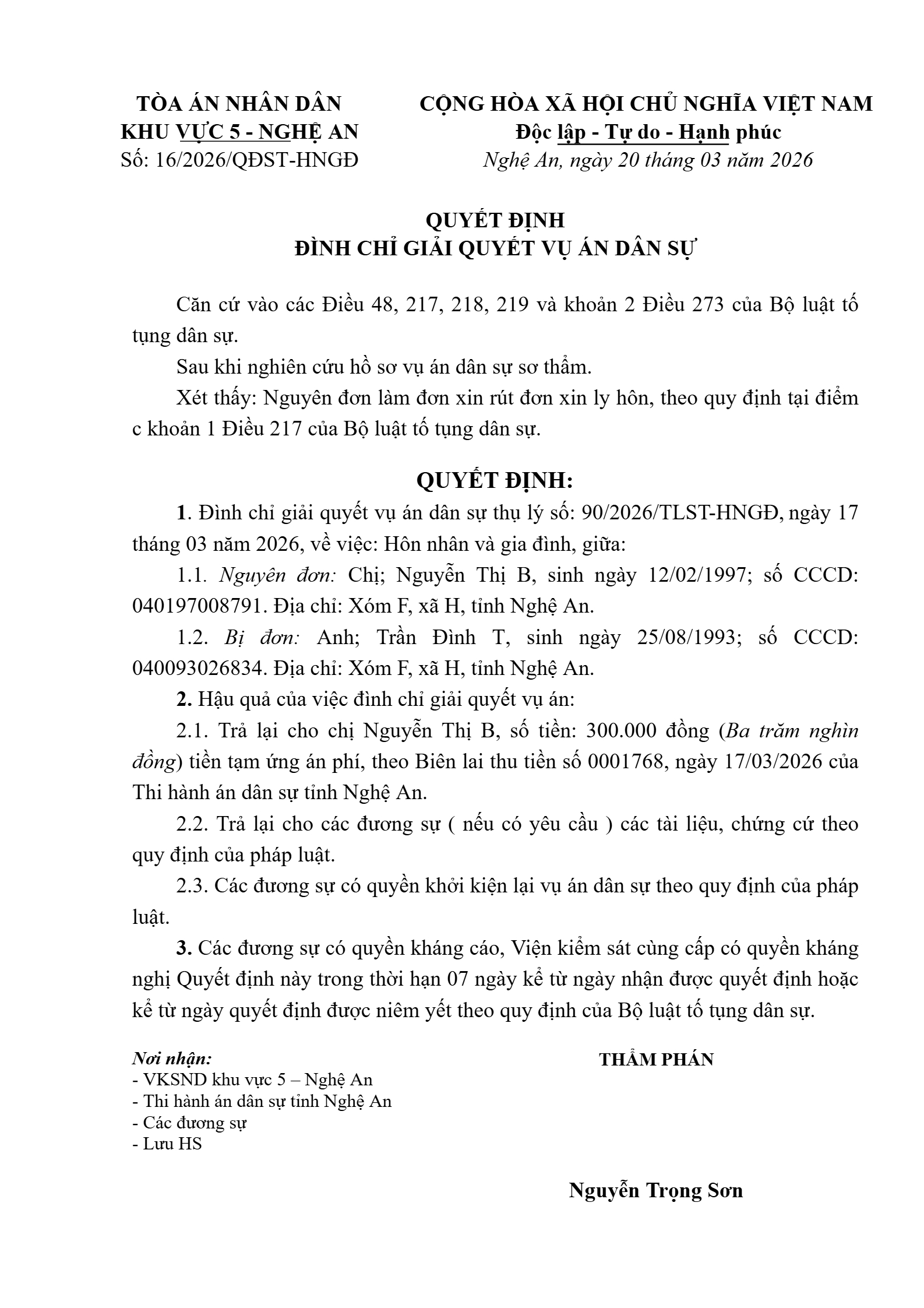 Quyết định số 16/2026/QĐST-HNGĐ ngày 20/03/2026 của Tòa án nhân dân khu vực 5 - Nghệ An, tỉnh Nghệ An về vụ án ly hôn về mâu thuẫn gia đình