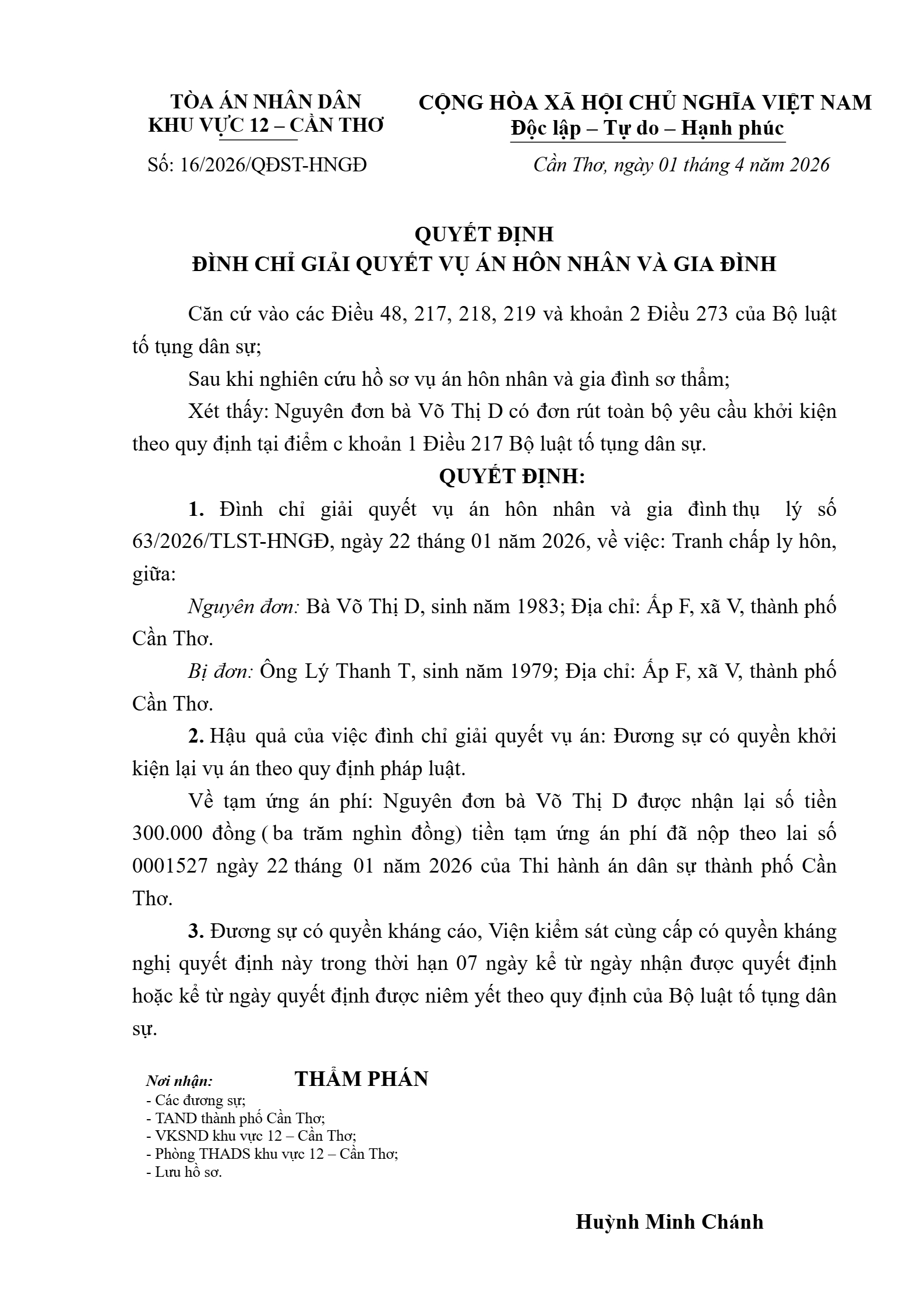 Quyết định số 16/2026/QĐST-HNGĐ ngày 01/04/2026 của Tòa án nhân dân khu vực 12 - Cần Thơ, TP. Cần Thơ về vụ án ly hôn về mâu thuẫn gia đình