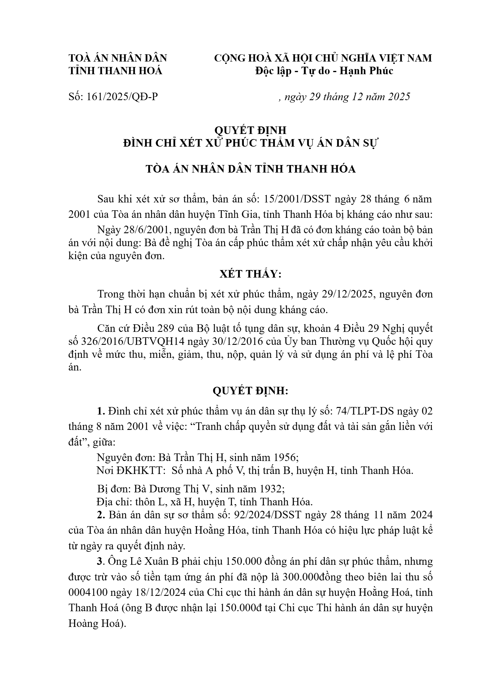 | Tên Quyết định: | Quyết định số 161/2025/QĐPT-DS ngày 29/12/2025 của TAND tỉnh Thanh Hóa về tranh chấp quyền sử dụng đất |