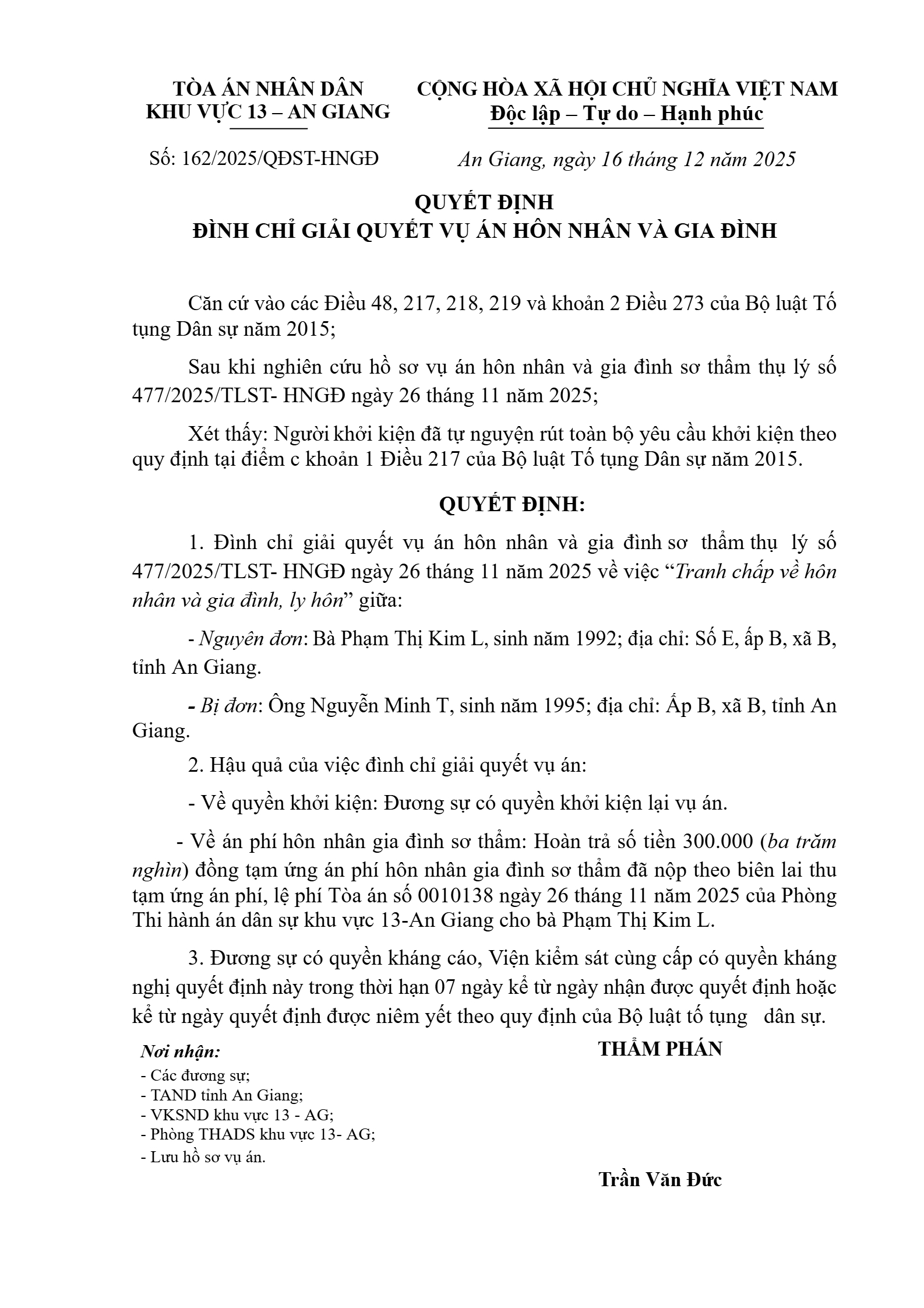 Quyết định số 162/2025/QĐST-HNGĐ ngày 16/12/2025 của Tòa án nhân dân khu vực 13 - An Giang, tỉnh An Giang về vụ án ly hôn về mâu thuẫn gia đình