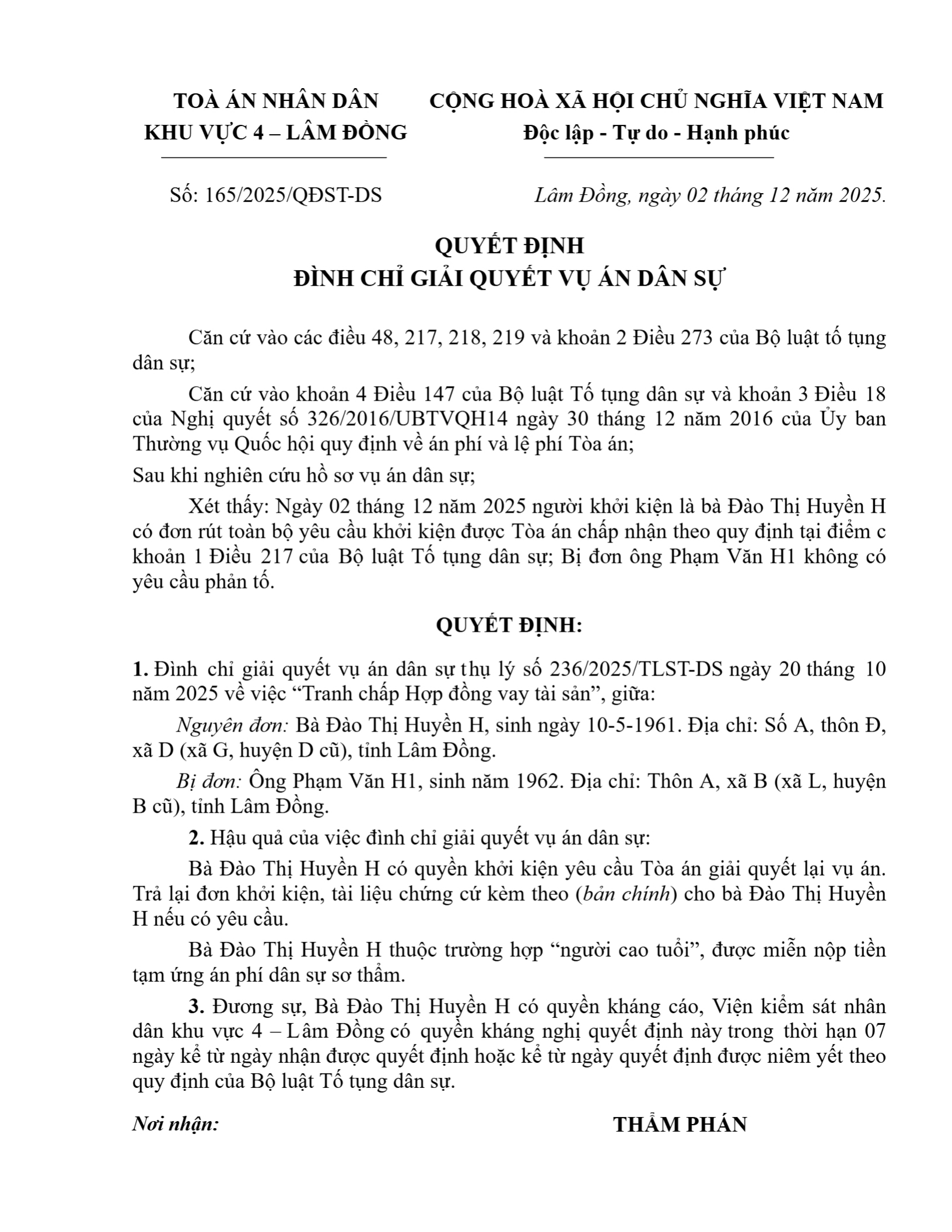 Quyết định số 165/2025/QĐST-DS ngày 02/12/2025 của Tòa án nhân dân khu vực 4 - Lâm Đồng, tỉnh Lâm Đồng về tranh chấp hợp đồng vay tài sản