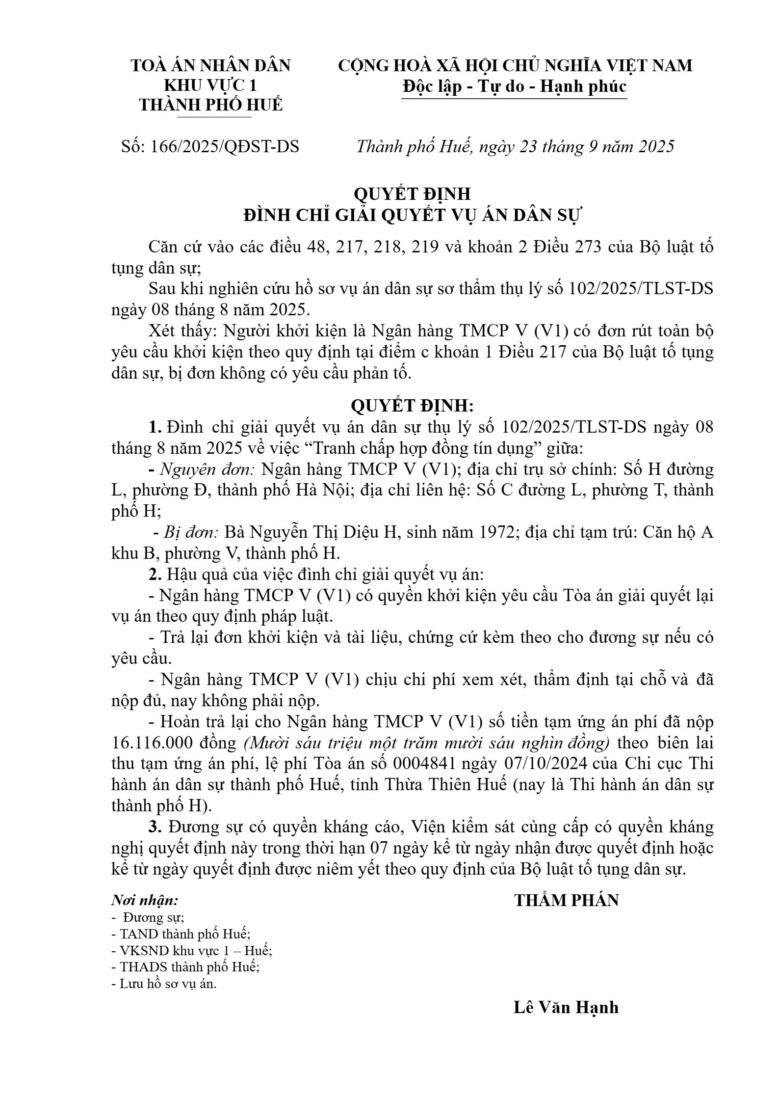Quyết định số 166/2025/QĐST-DS ngày 23/09/2025 của Tòa án nhân dân khu vực 1 - Huế, TP. Huế về tranh chấp hợp đồng tín dụng
