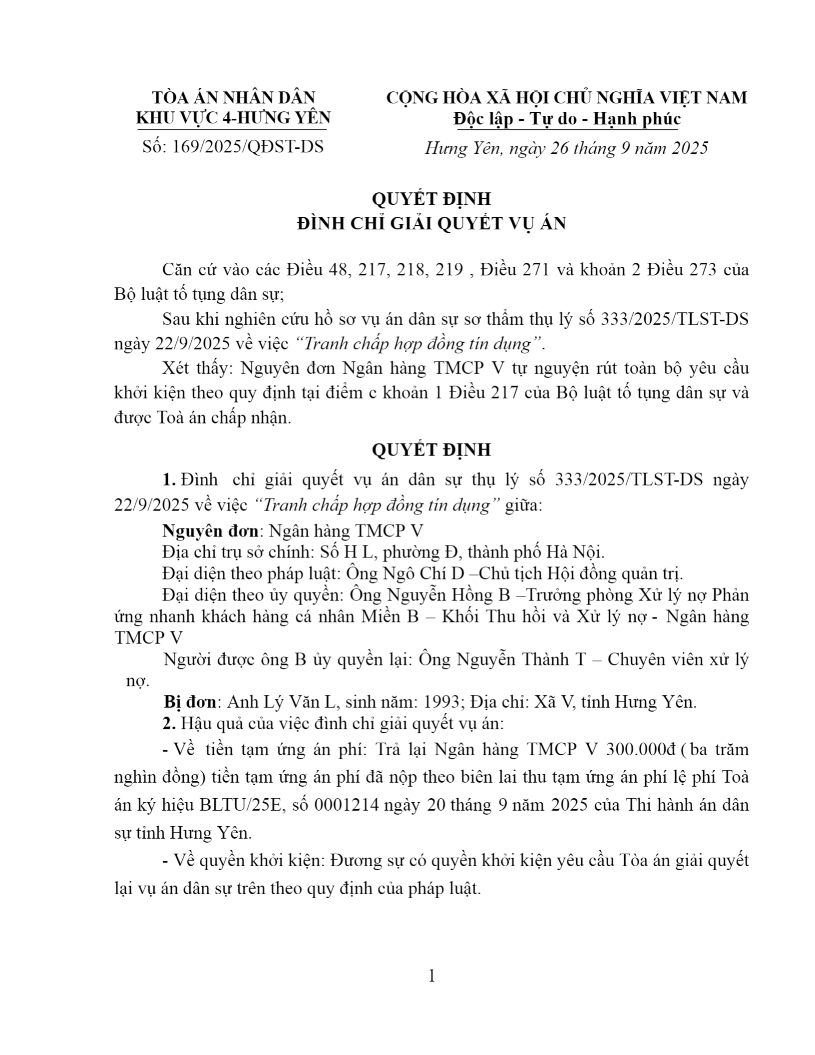 Quyết định số 169/2025/QĐST-DS ngày 26/09/2025 của Tòa án nhân dân khu vực 4 - Hưng Yên, tỉnh Hưng Yên về tranh chấp hợp đồng tín dụng