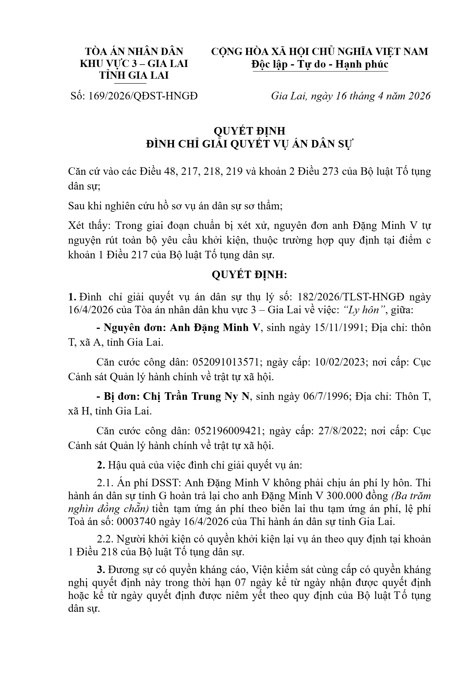 Quyết định số 169/2026/QĐST-HNGĐ ngày 16/04/2026 của Tòa án nhân dân khu vực 3 - Gia Lai, tỉnh Gia Lai về vụ án ly hôn về mâu thuẫn gia đình