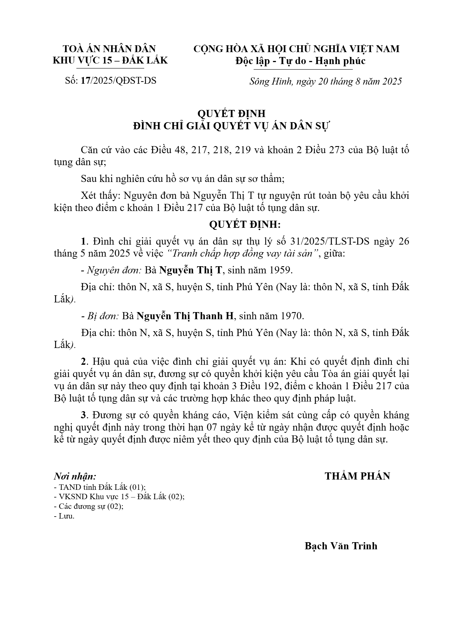 Quyết định số 17/2025/QĐST-DS ngày 20/08/2025 của Tòa án nhân dân khu vực 15 - Đắk Lắk, tỉnh Đắk Lắk về tranh chấp hợp đồng vay tài sản
