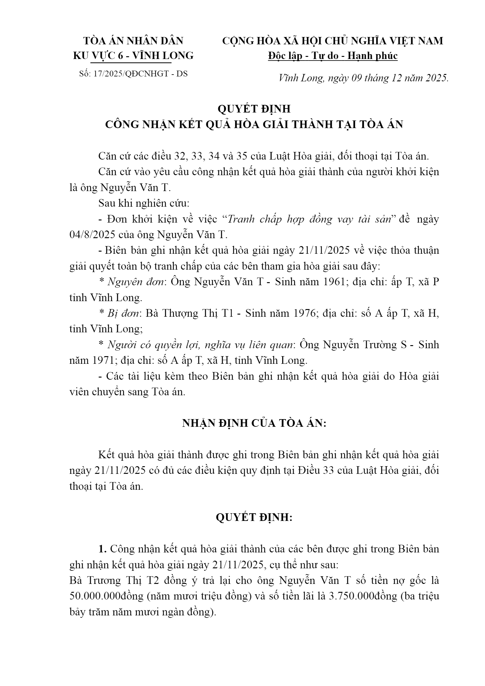 Quyết định số 17/2025/QĐST-DS ngày 09/12/2025 của Tòa án nhân dân khu vực 6 - Vĩnh Long, tỉnh Vĩnh Long về tranh chấp hợp đồng vay tài sản