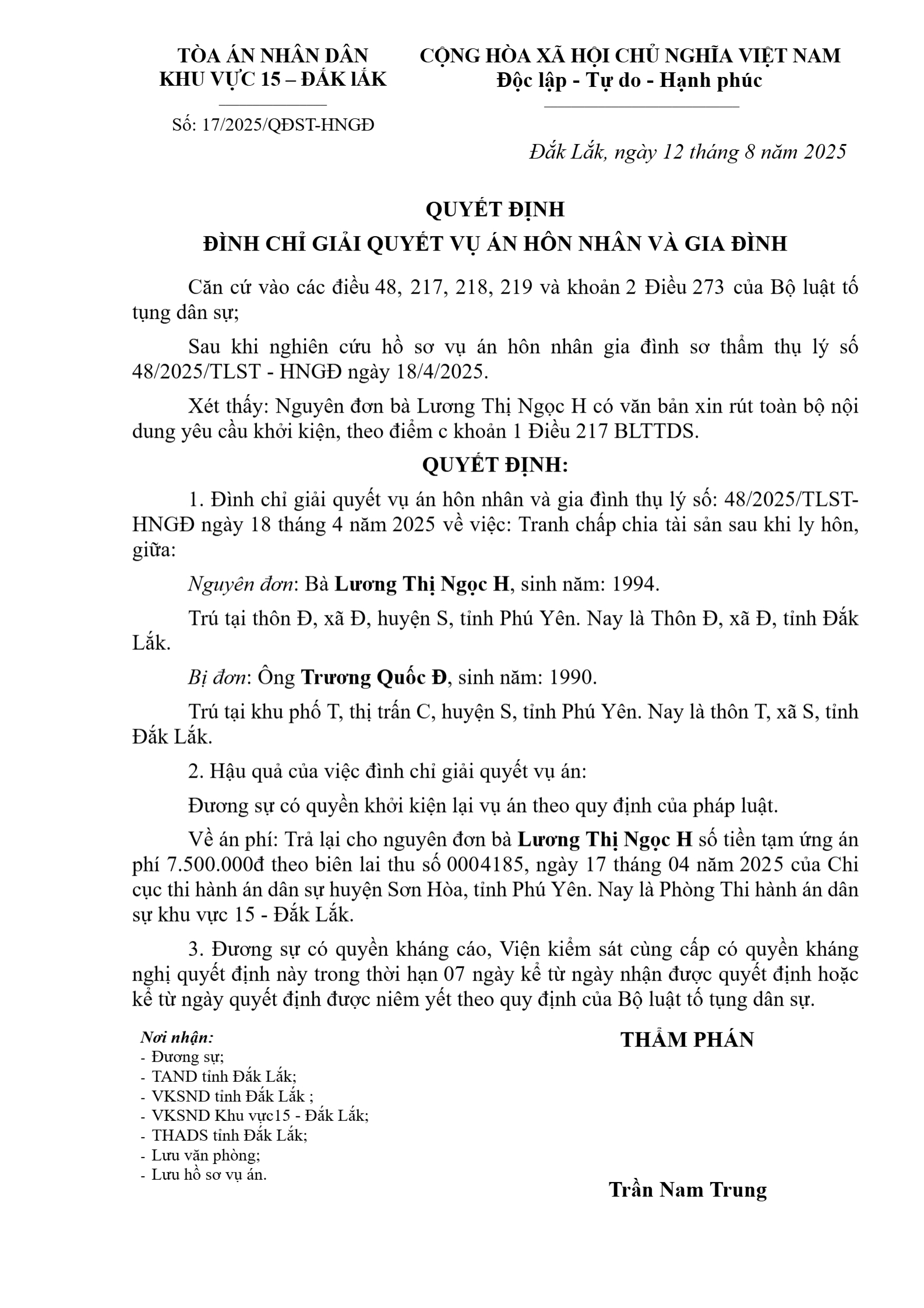 Quyết định số 17/2025/QĐST-HNGĐ ngày 12/08/2025 của Tòa án nhân dân khu vực 15 - Đắk Lắk, tỉnh Đắk Lắk về vụ án ly hôn về mâu thuẫn gia đình