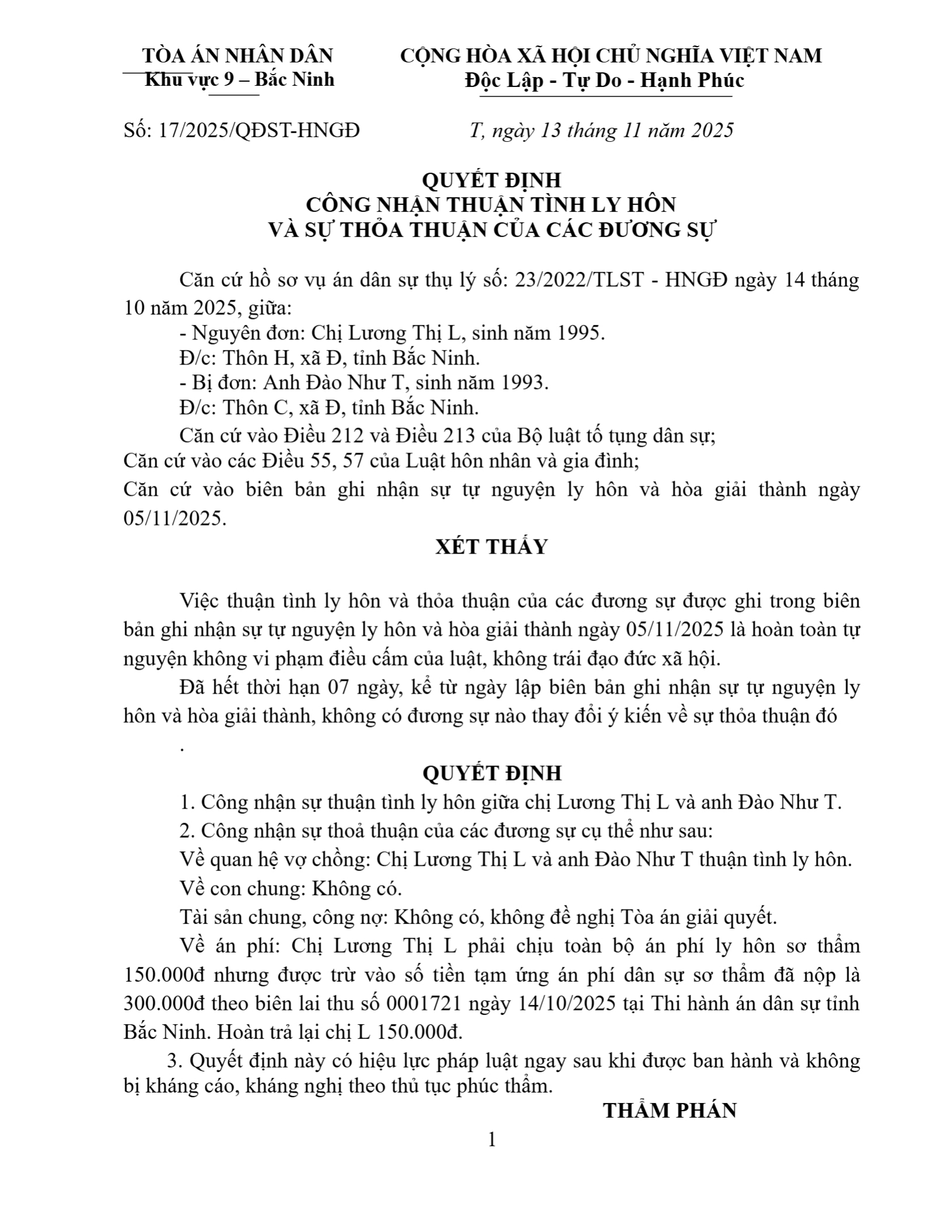Quyết định số 17/2025/QĐST-HNGĐ ngày 13/11/2025 của Tòa án nhân dân khu vực 9 - Bắc Ninh, tỉnh Bắc Ninh về vụ án ly hôn về mâu thuẫn gia đình