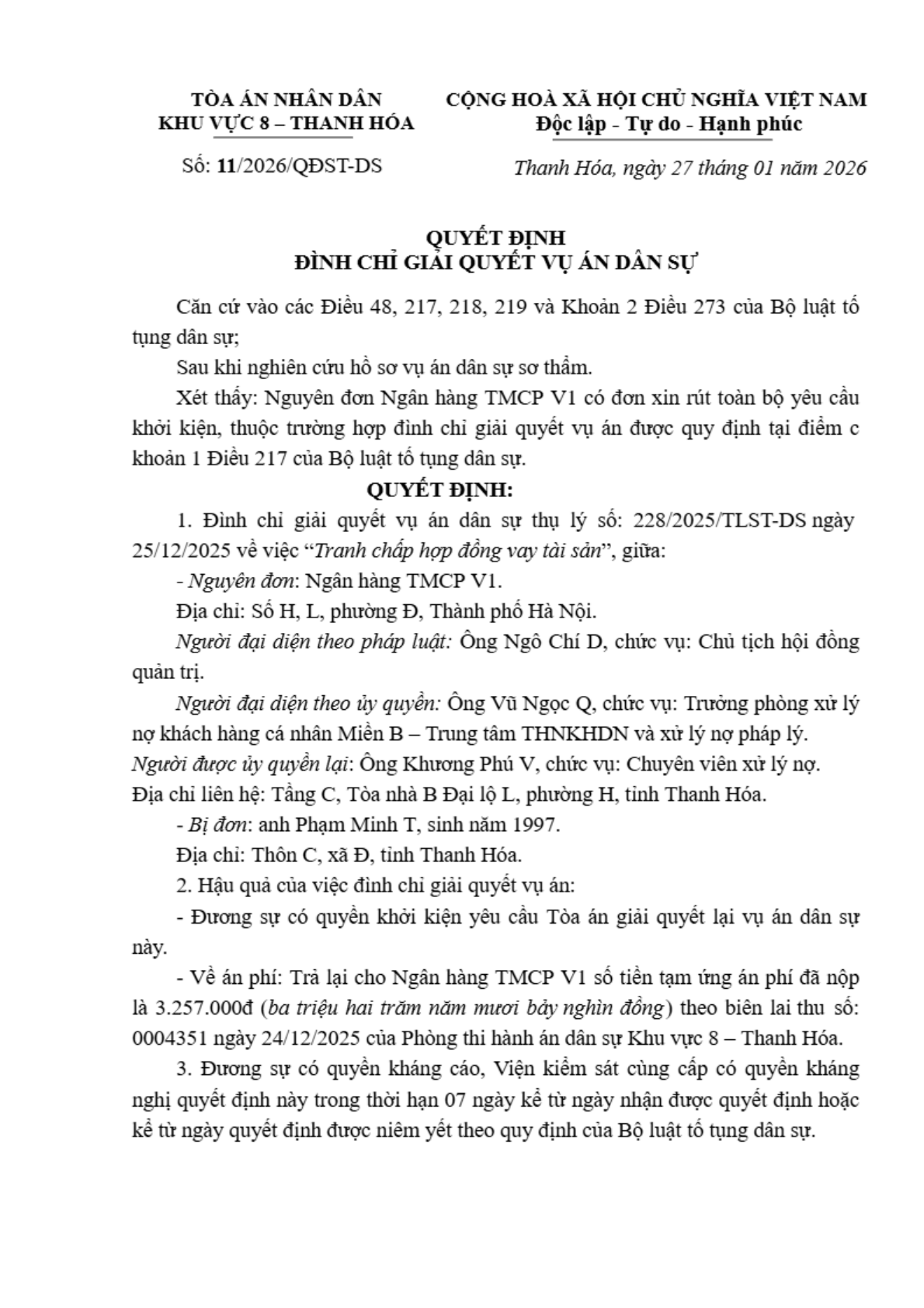 Quyết định số 17/2026/QĐST-DS ngày 27/01/2026 của Tòa án nhân dân khu vực 8 - Thanh Hóa, tỉnh Thanh Hóa về tranh chấp hợp đồng tín dụng
