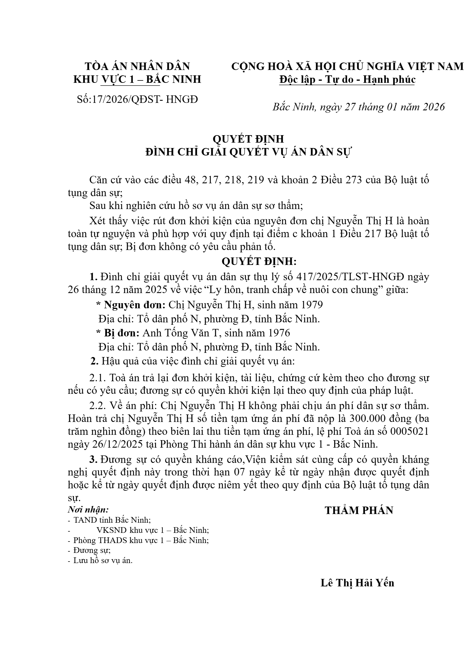 Quyết định số 17/2026/QĐST-HNGĐ ngày 27/01/2026 của Tòa án nhân dân khu vực 1 - Bắc Ninh, tỉnh Bắc Ninh về vụ án ly hôn về mâu thuẫn gia đình
