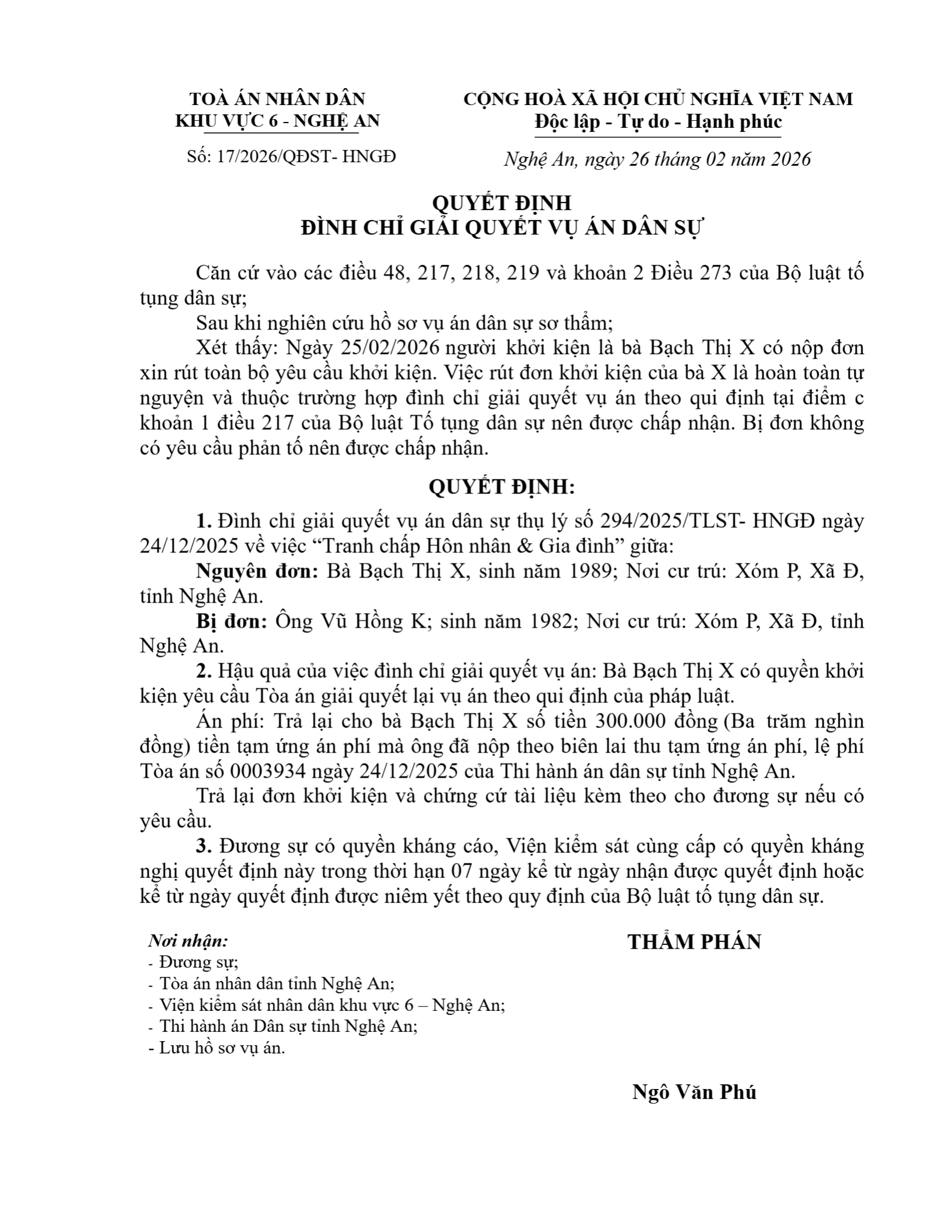 Quyết định số 17/2026/QĐST-HNGĐ ngày 26/02/2026 của Tòa án nhân dân khu vực 6 - Nghệ An, tỉnh Nghệ An về vụ án ly hôn về mâu thuẫn gia đình