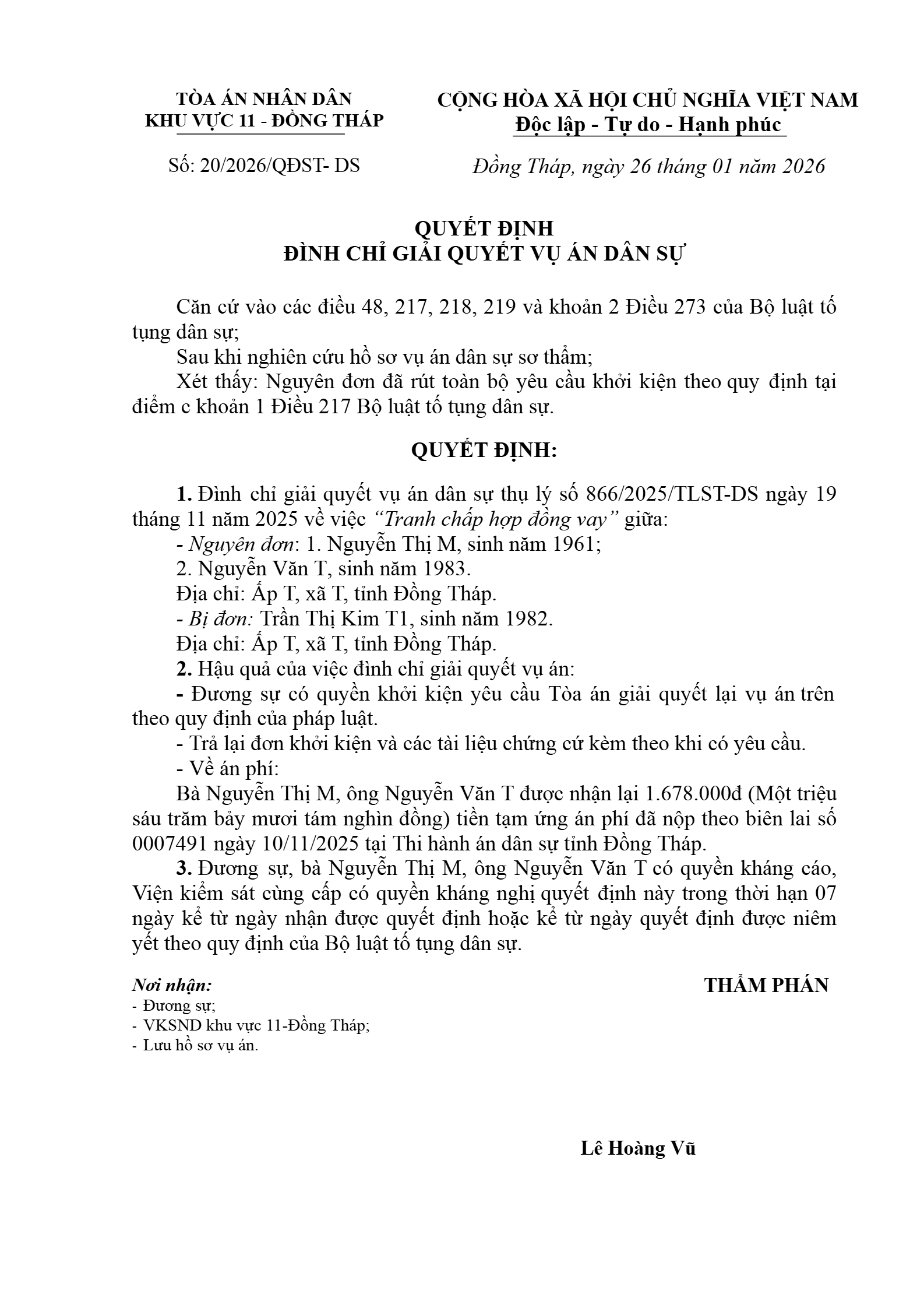 | Tòa án xét xử: | Tòa án nhân dân khu vực 11 - Đồng Tháp, tỉnh Đồng Tháp |