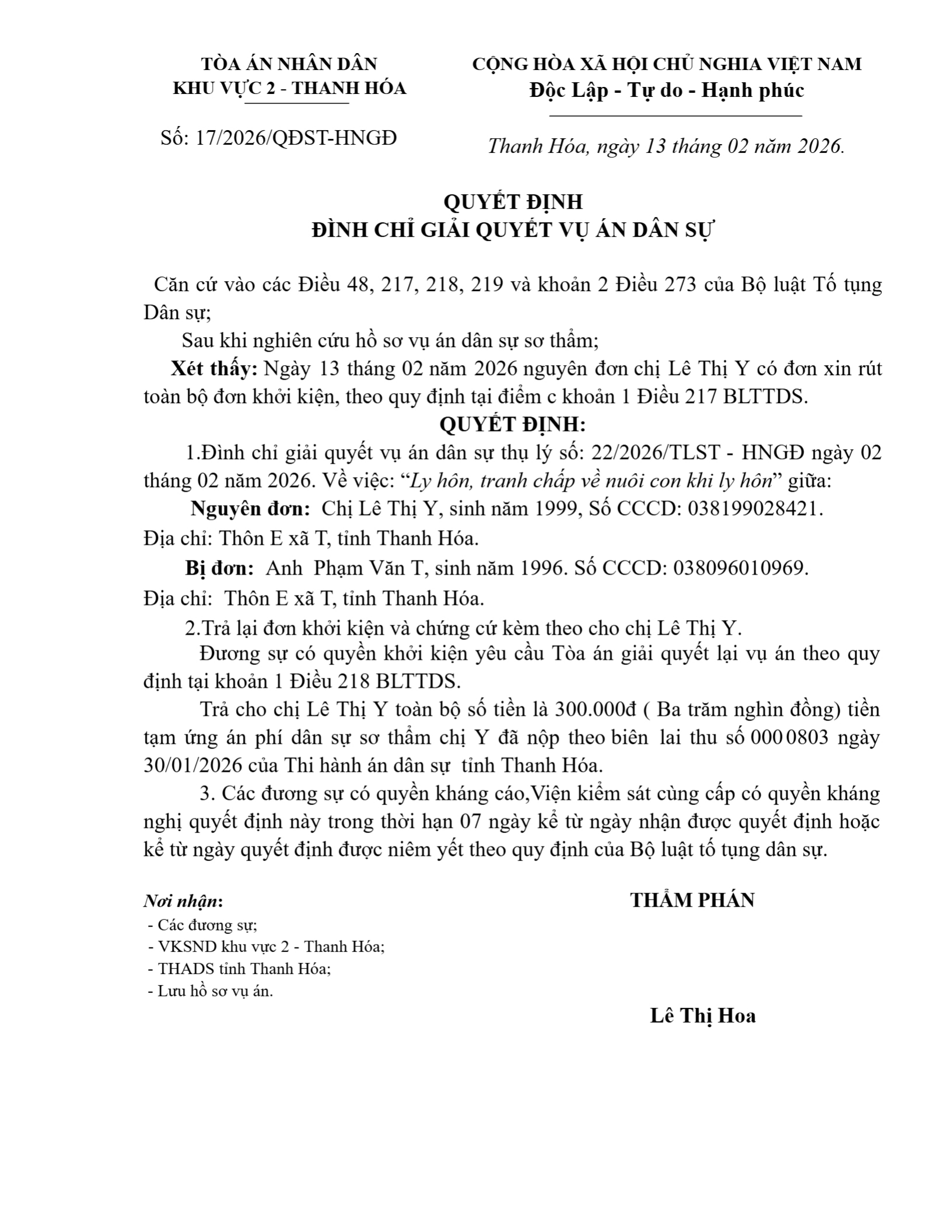 Quyết định số 17/2026/QĐST-HNGĐ ngày 13/02/2026 của Tòa án nhân dân khu vực 2 - Thanh Hóa, tỉnh Thanh Hóa về vụ án ly hôn về mâu thuẫn gia đình