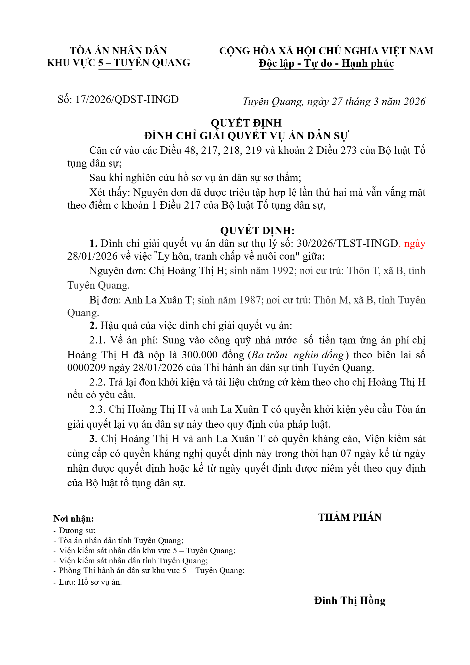Quyết định số 17/2026/QĐST-HNGĐ ngày 27/03/2026 của Tòa án nhân dân khu vực 5 - Tuyên Quang, tỉnh Tuyên Quang về vụ án ly hôn về mâu thuẫn gia đình