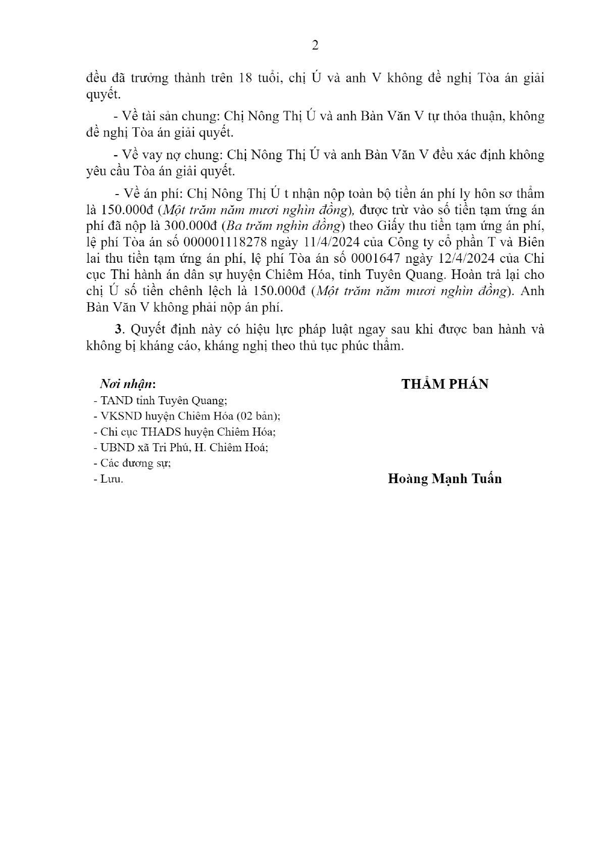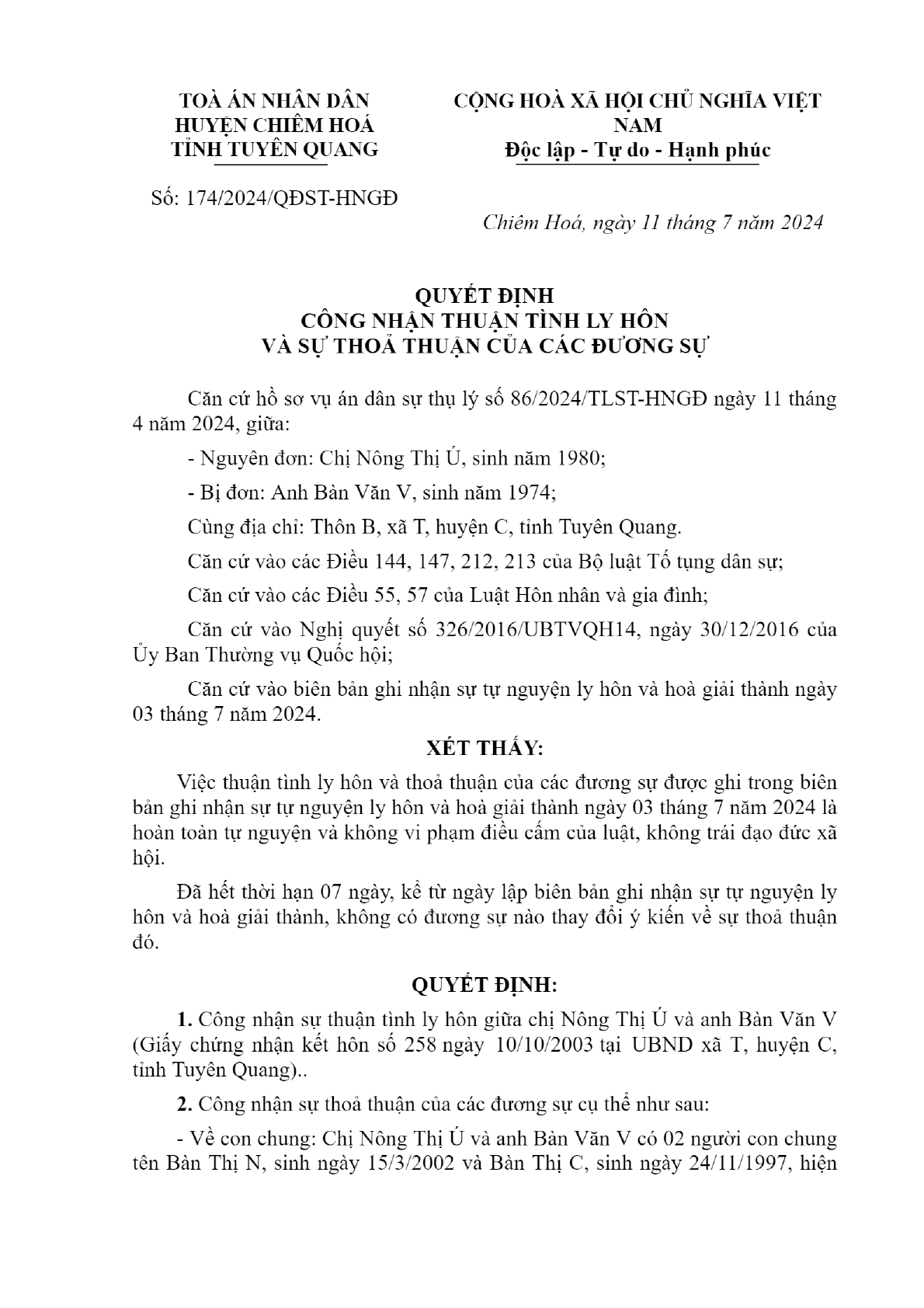 Quyết định số 174/2024/QĐST-HNGĐ ngày 11/07/2024 của TAND huyện Chiêm Hóa, tỉnh Tuyên Quang về vụ án ly hôn về mâu thuẫn gia đình