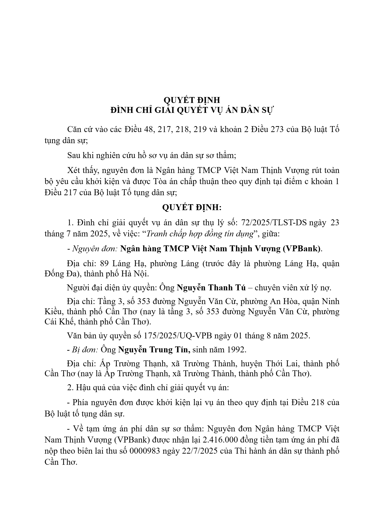 | Thông tin về vụ/việc: | TC HĐ tín dụng |