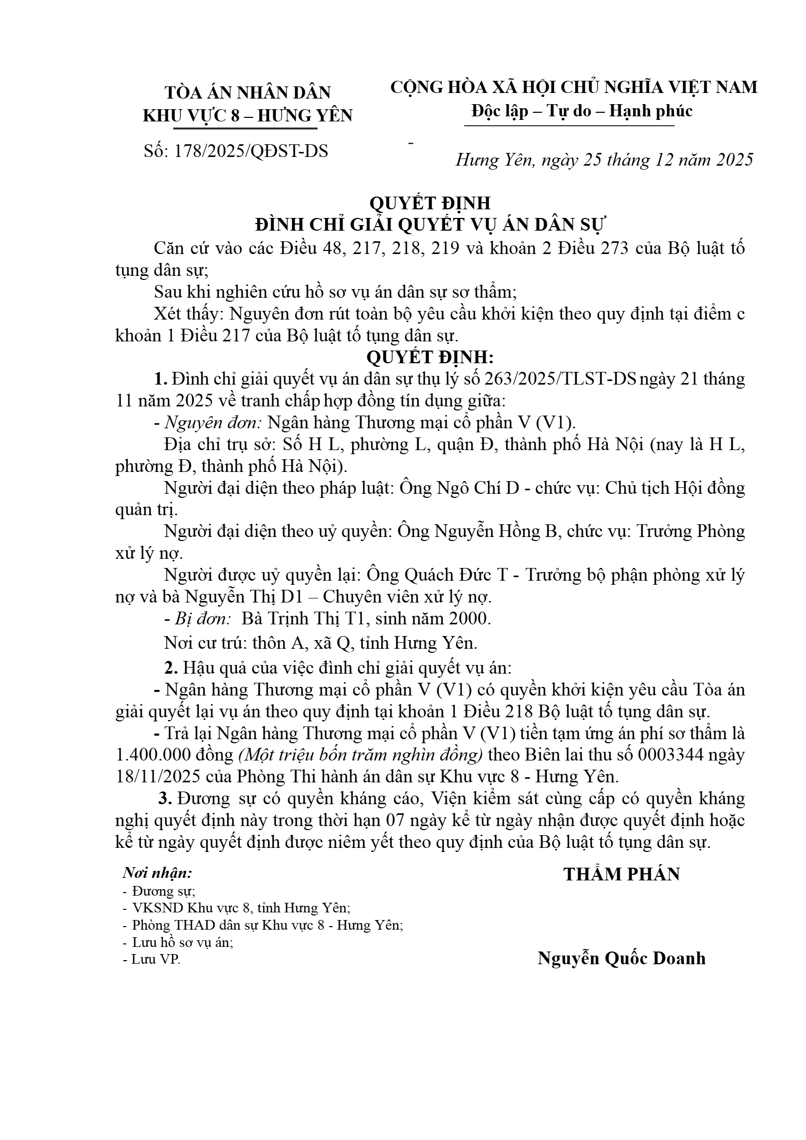 Quyết định số 178/2025/QĐST-DS ngày 25/12/2025 của Tòa án nhân dân khu vực 8 - Hưng Yên, tỉnh Hưng Yên về tranh chấp hợp đồng tín dụng