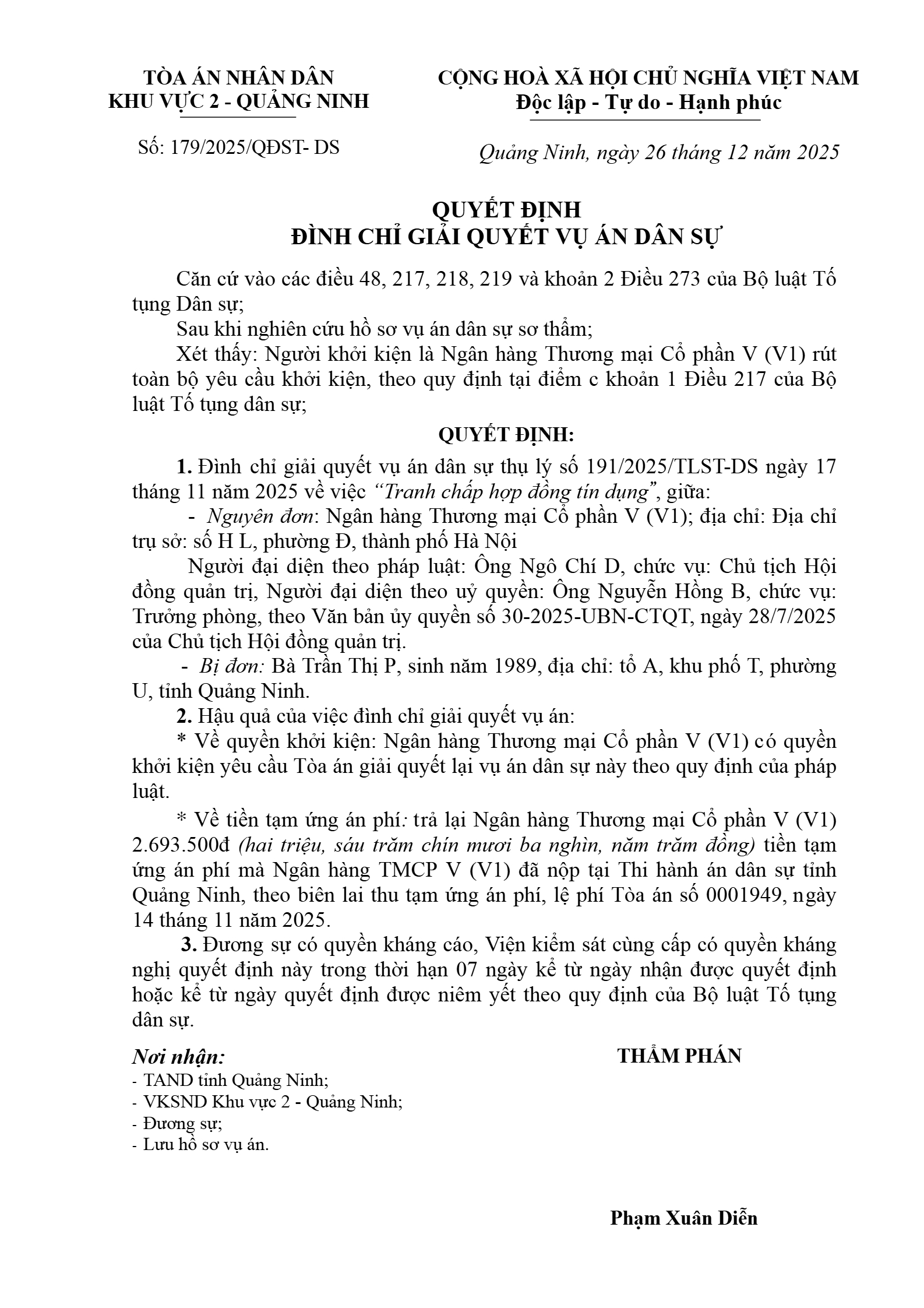 Quyết định số 179/2025/QĐST-DS ngày 26/12/2025 của Tòa án nhân dân khu vực 2 - Quảng Ninh, tỉnh Quảng Ninh về tranh chấp hợp đồng tín dụng