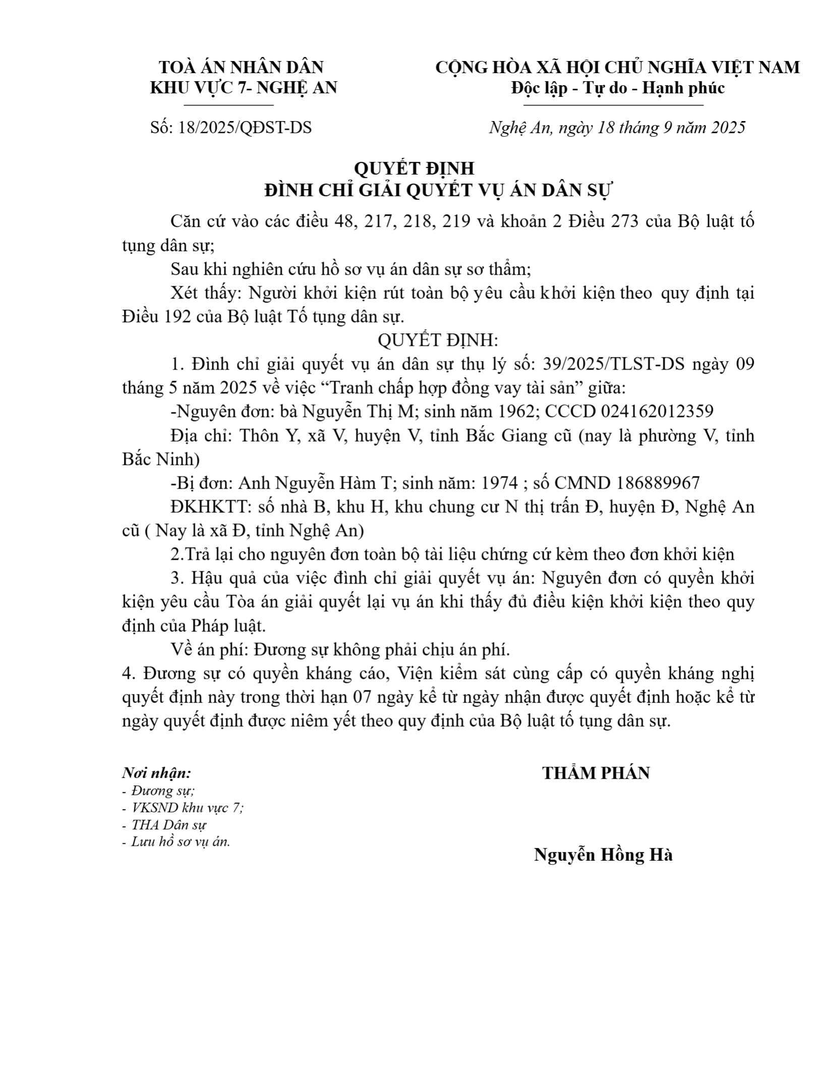 Quyết định số 18/2025/QĐST-DS ngày 18/09/2025 của Tòa án nhân dân khu vực 7 - Nghệ An, tỉnh Nghệ An về tranh chấp hợp đồng vay tài sản