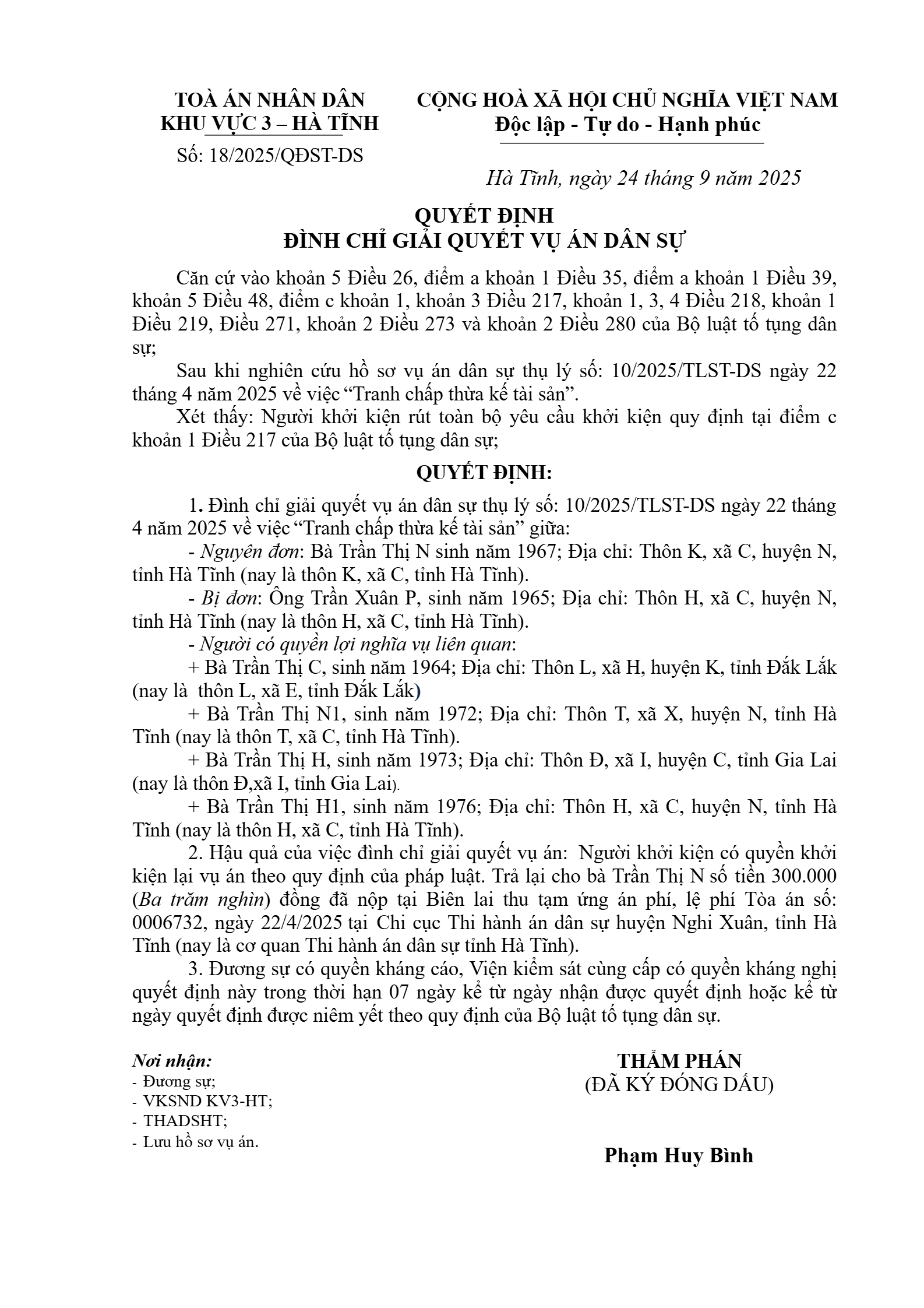 Quyết định số 18/2025/QĐST-DS ngày 24/09/2025 của Tòa án nhân dân khu vực 3 - Hà Tĩnh, tỉnh Hà Tĩnh về tranh chấp về thừa kế tài sản
