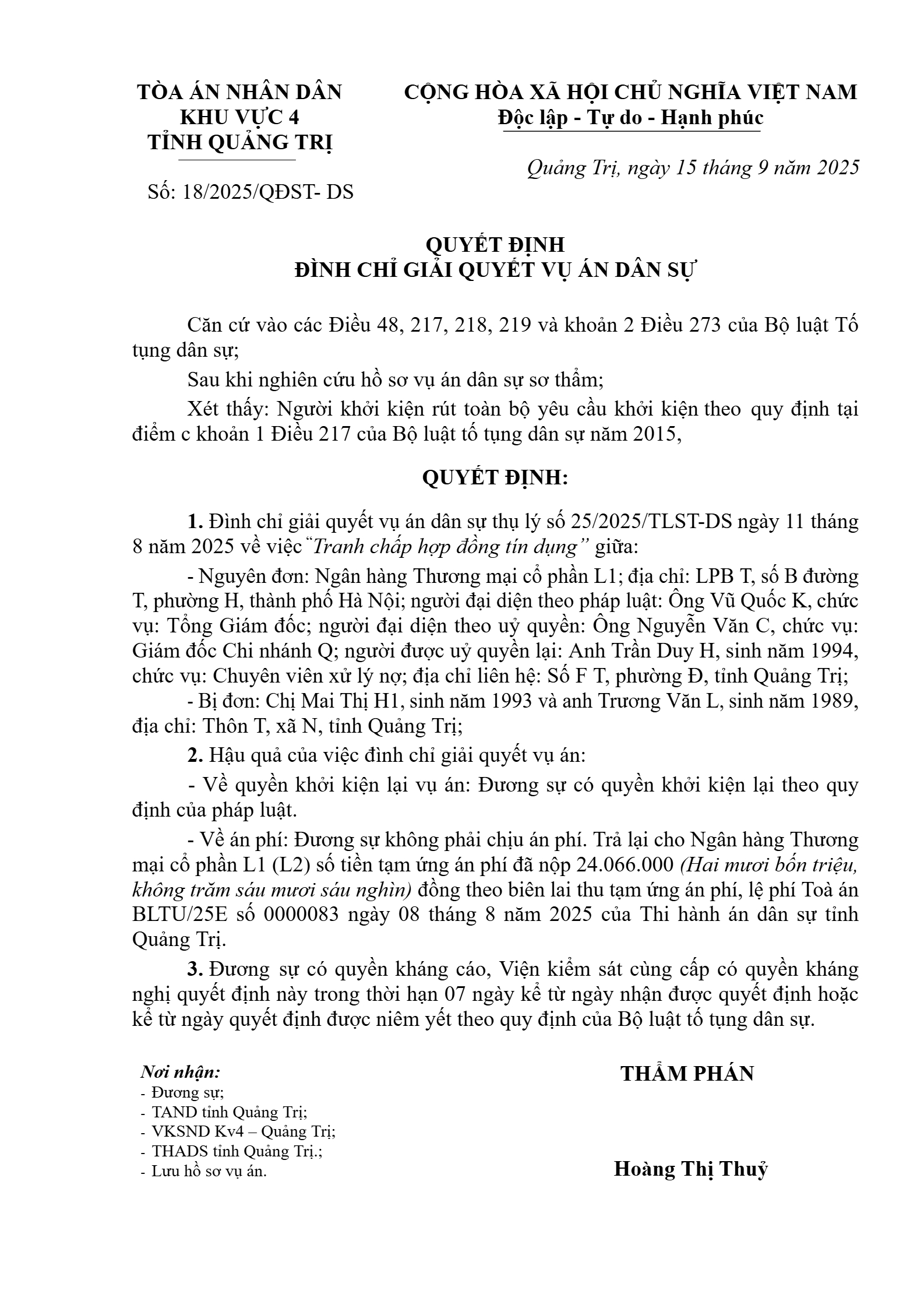 Quyết định số 18/2025/QĐST-DS ngày 15/09/2025 của Tòa án nhân dân khu vực 4 - Quảng Trị, tỉnh Quảng Trị về tranh chấp hợp đồng tín dụng