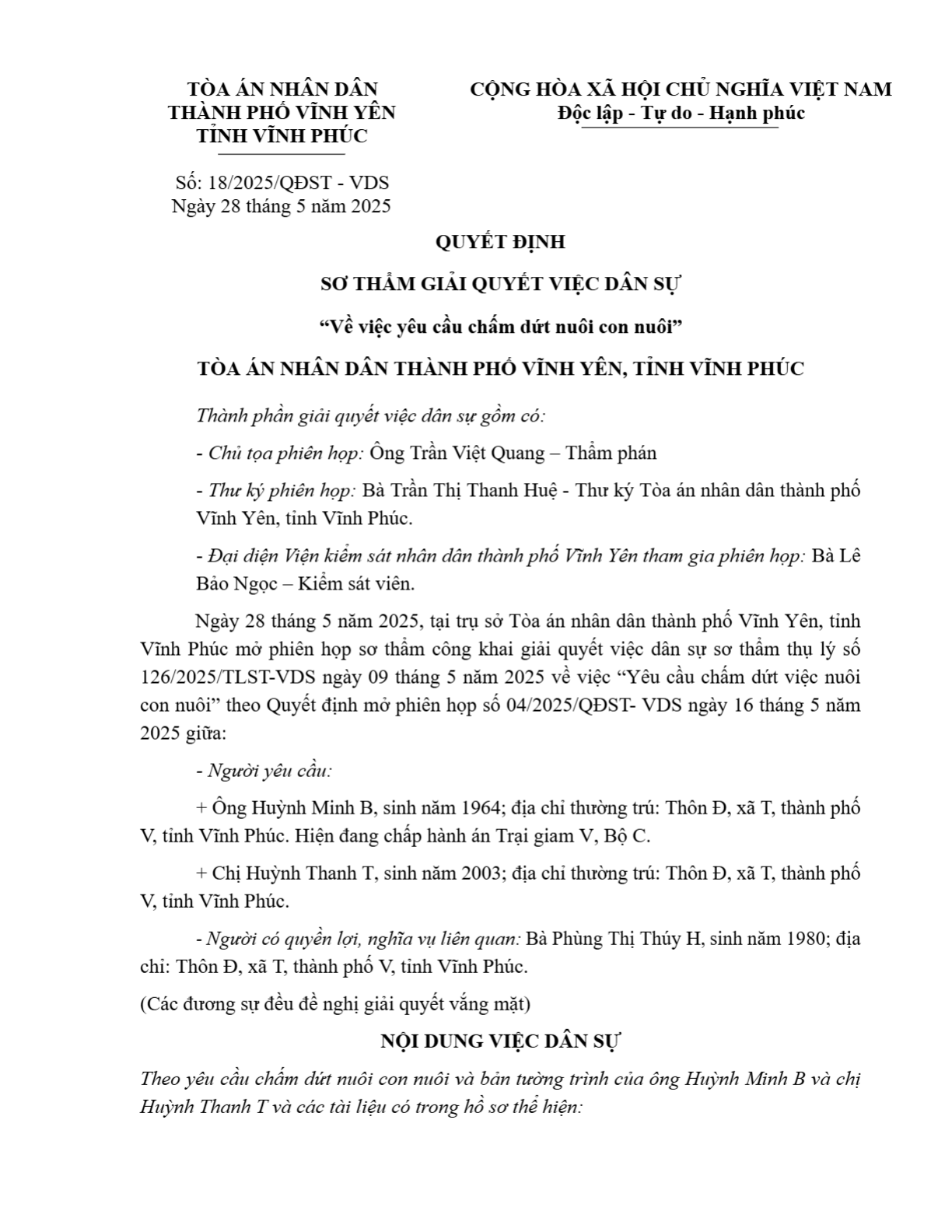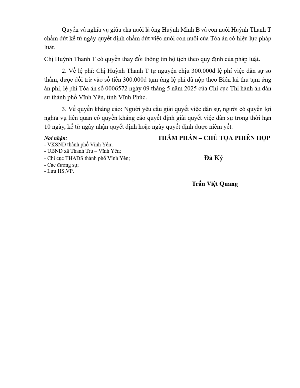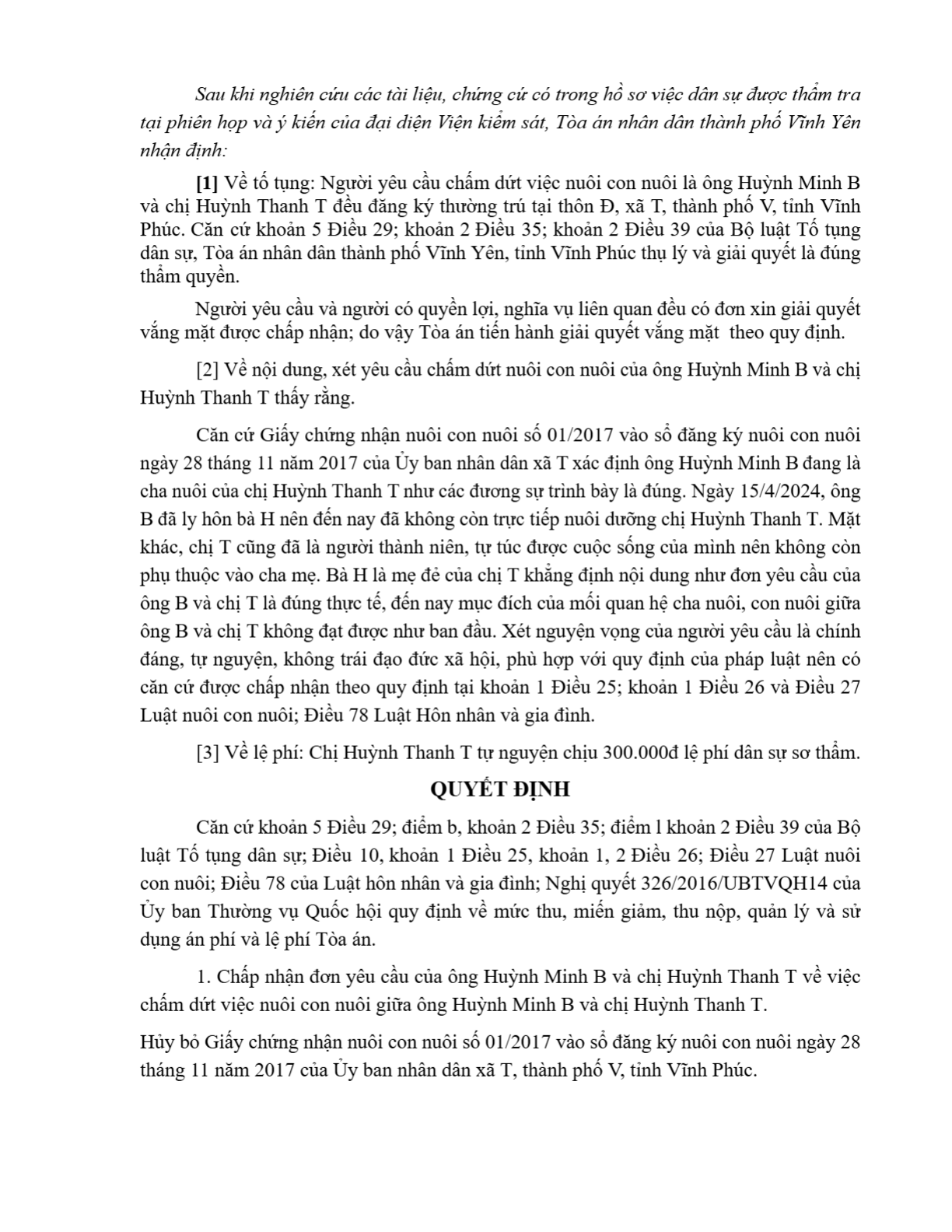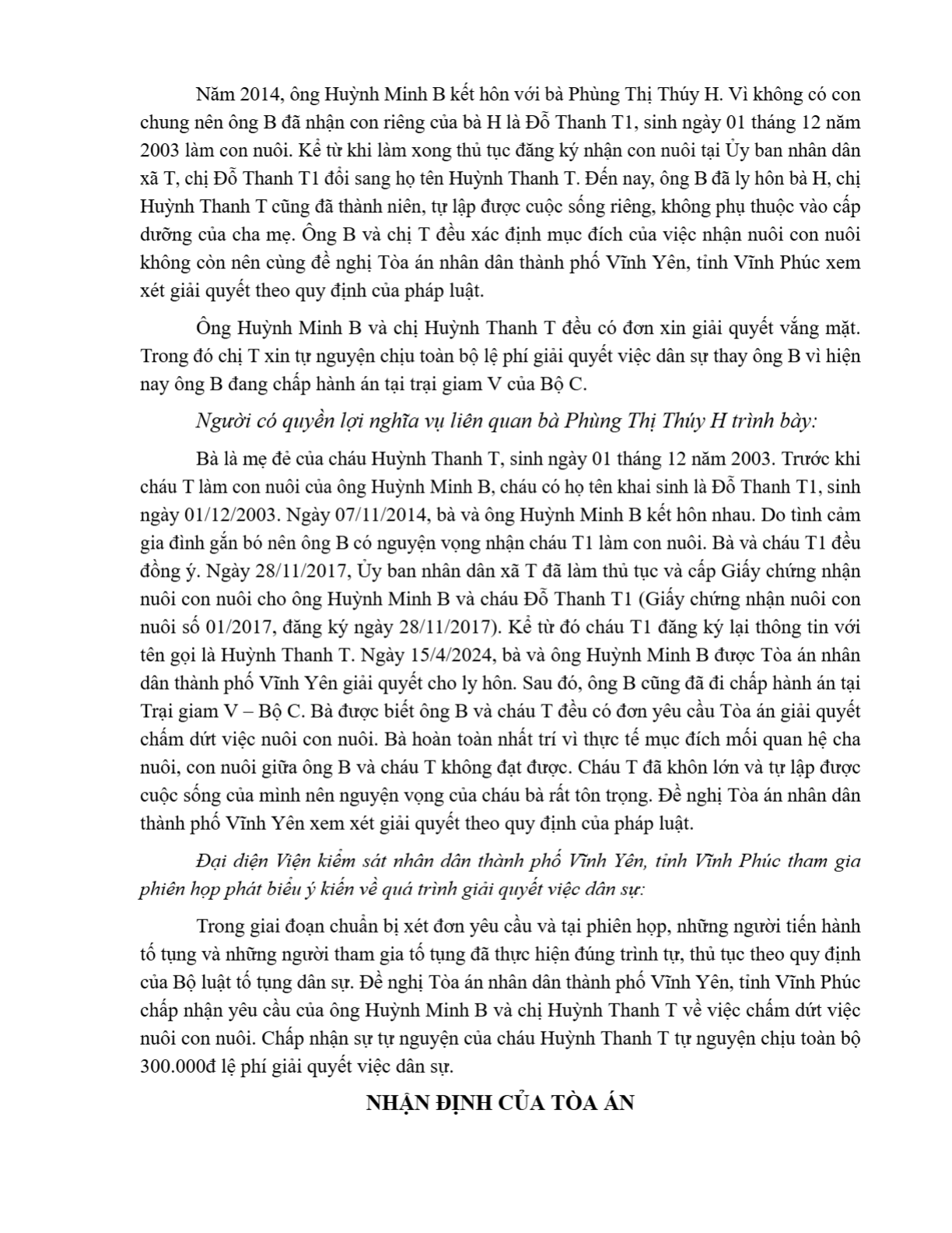 | Thông tin về vụ/việc: | Ông Huỳnh Minh B chấm dứt việc nuôi con nuôi với chị Huỳnh Thanh T |