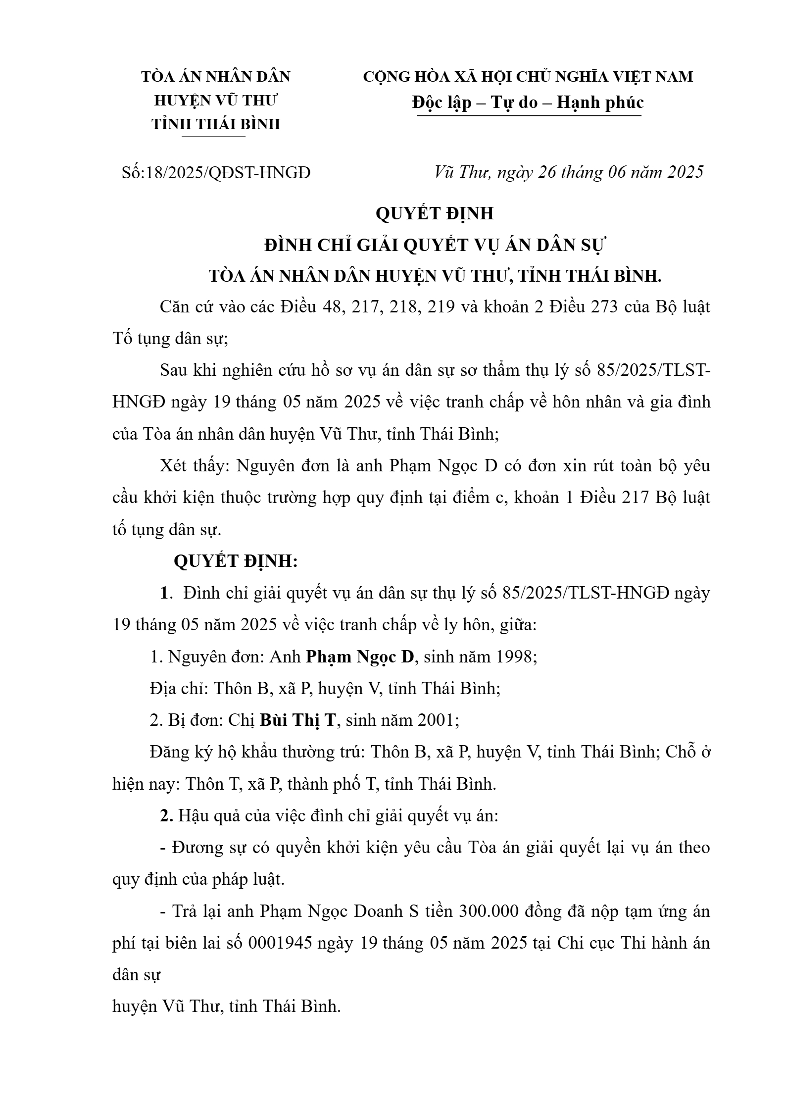 Quyết định số 18/2025/QĐST-HNGĐ ngày 26/06/2025 của TAND huyện Vũ Thư, tỉnh Thái Bình về vụ án ly hôn về mâu thuẫn gia đình