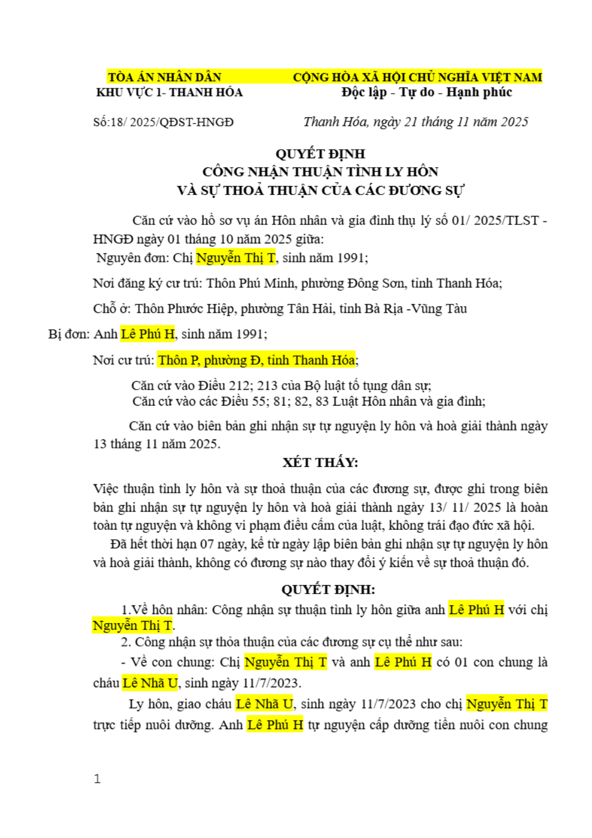 Quyết định số 18/2025/QĐST-HNGĐ ngày 21/11/2025 của Tòa án nhân dân khu vực 1 - Thanh Hóa, tỉnh Thanh Hóa về vụ án ly hôn về mâu thuẫn gia đình