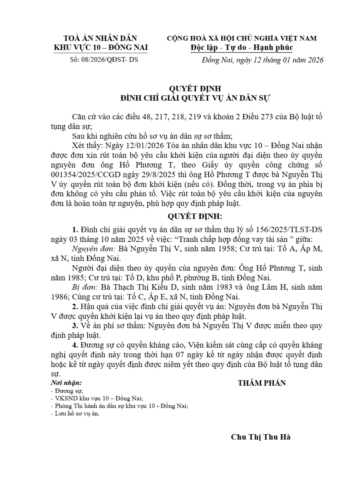 Quyết định số 18/2026/QĐST-DS ngày 12/01/2026 của Tòa án nhân dân khu vực 10 - Đồng Nai, tỉnh Đồng Nai về tranh chấp hợp đồng vay tài sản