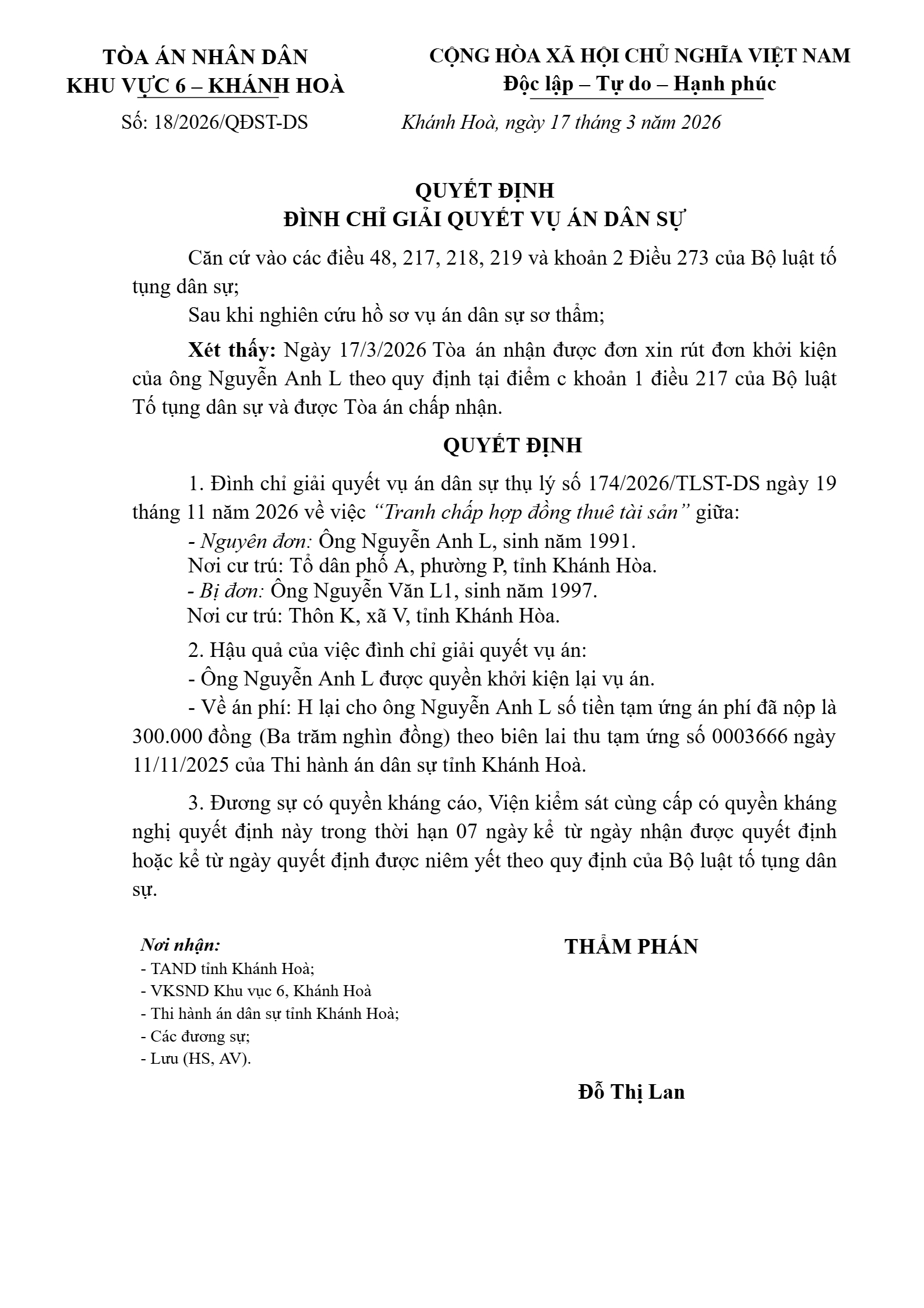 Quyết định số 18/2026/QĐST-DS ngày 17/03/2026 của Tòa án nhân dân khu vực 6 - Khánh Hòa, tỉnh Khánh Hòa về tranh chấp hợp đồng vay tài sản