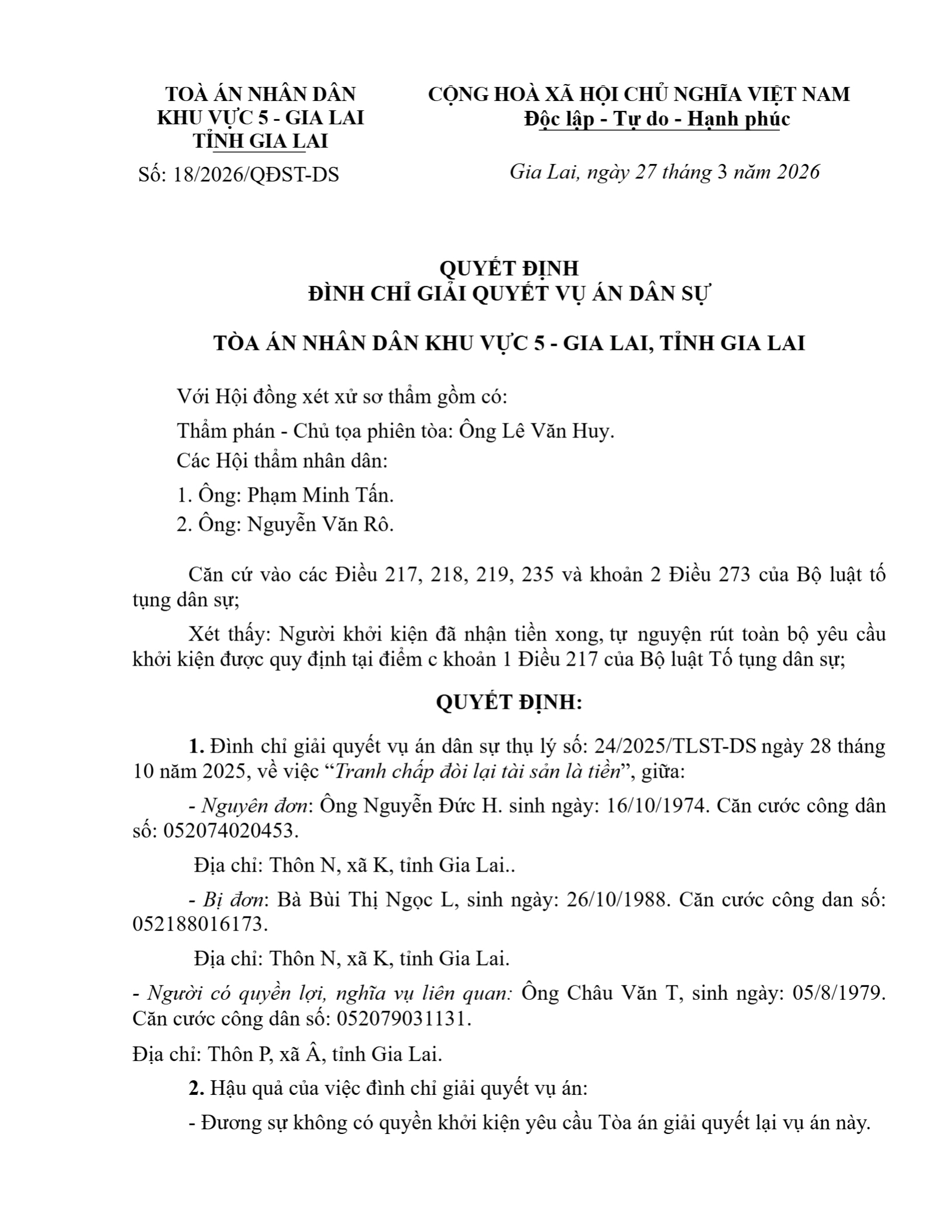 Quyết định số 18/2026/QĐST-DS ngày 27/03/2026 của Tòa án nhân dân khu vực 5 - Gia Lai, tỉnh Gia Lai về tranh chấp về quyền sở hữu và các quyền khác đối với tài sản