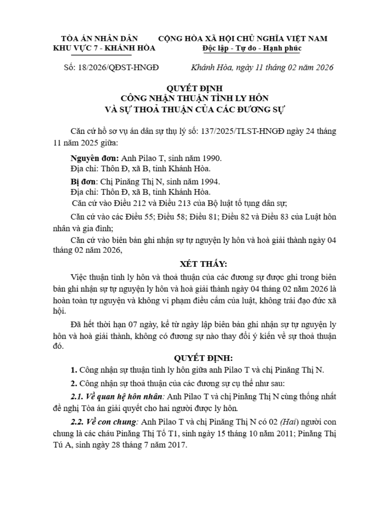 Quyết định số 18/2026/QĐST-HNGĐ ngày 11/02/2026 của Tòa án nhân dân khu vực 7 - Khánh Hòa, tỉnh Khánh Hòa về vụ án ly hôn về mâu thuẫn gia đình