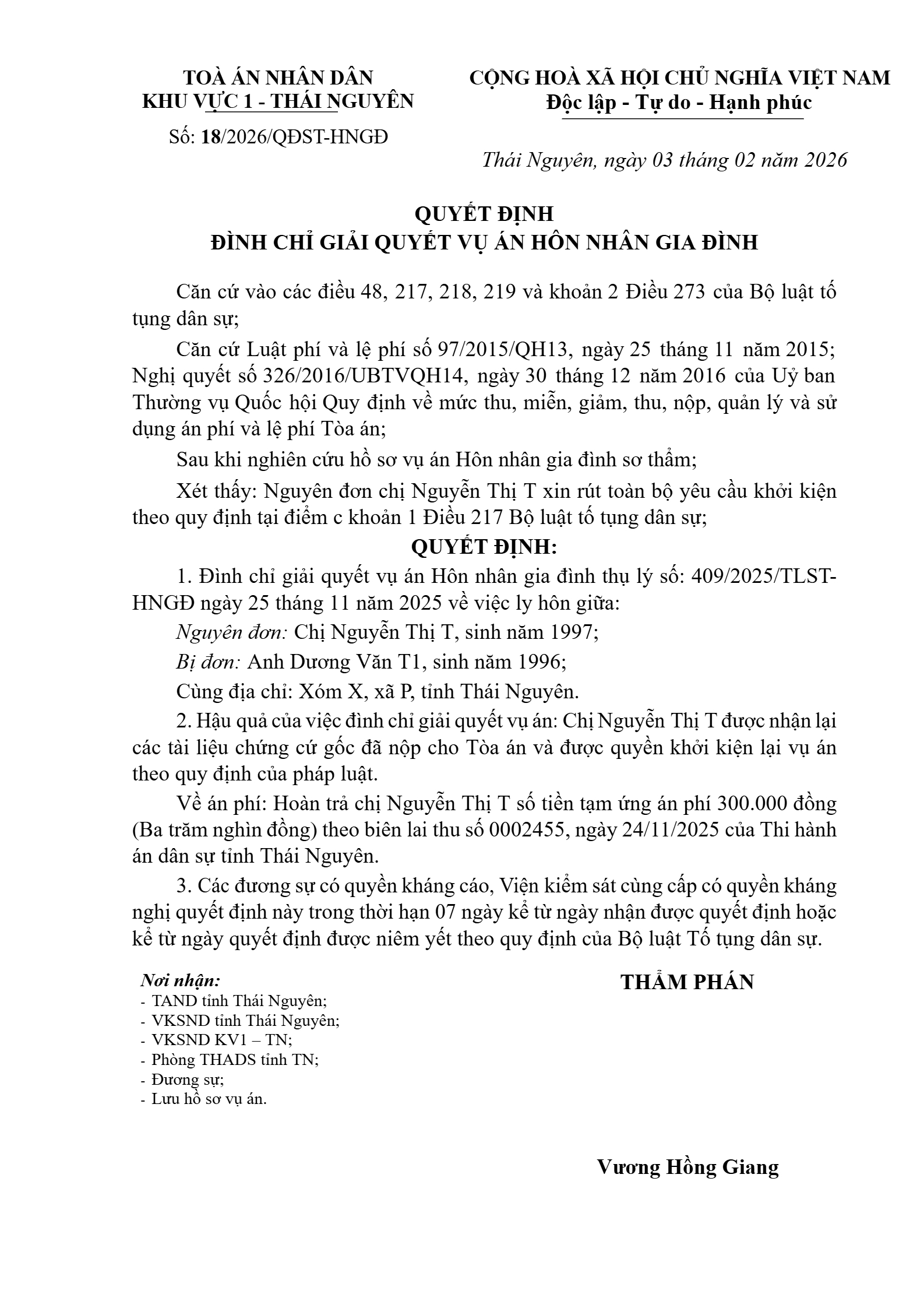 Quyết định số 18/2026/QĐST-HNGĐ ngày 03/02/2026 của Tòa án nhân dân khu vực 1 - Thái Nguyên, tỉnh Thái Nguyên về vụ án ly hôn về mâu thuẫn gia đình