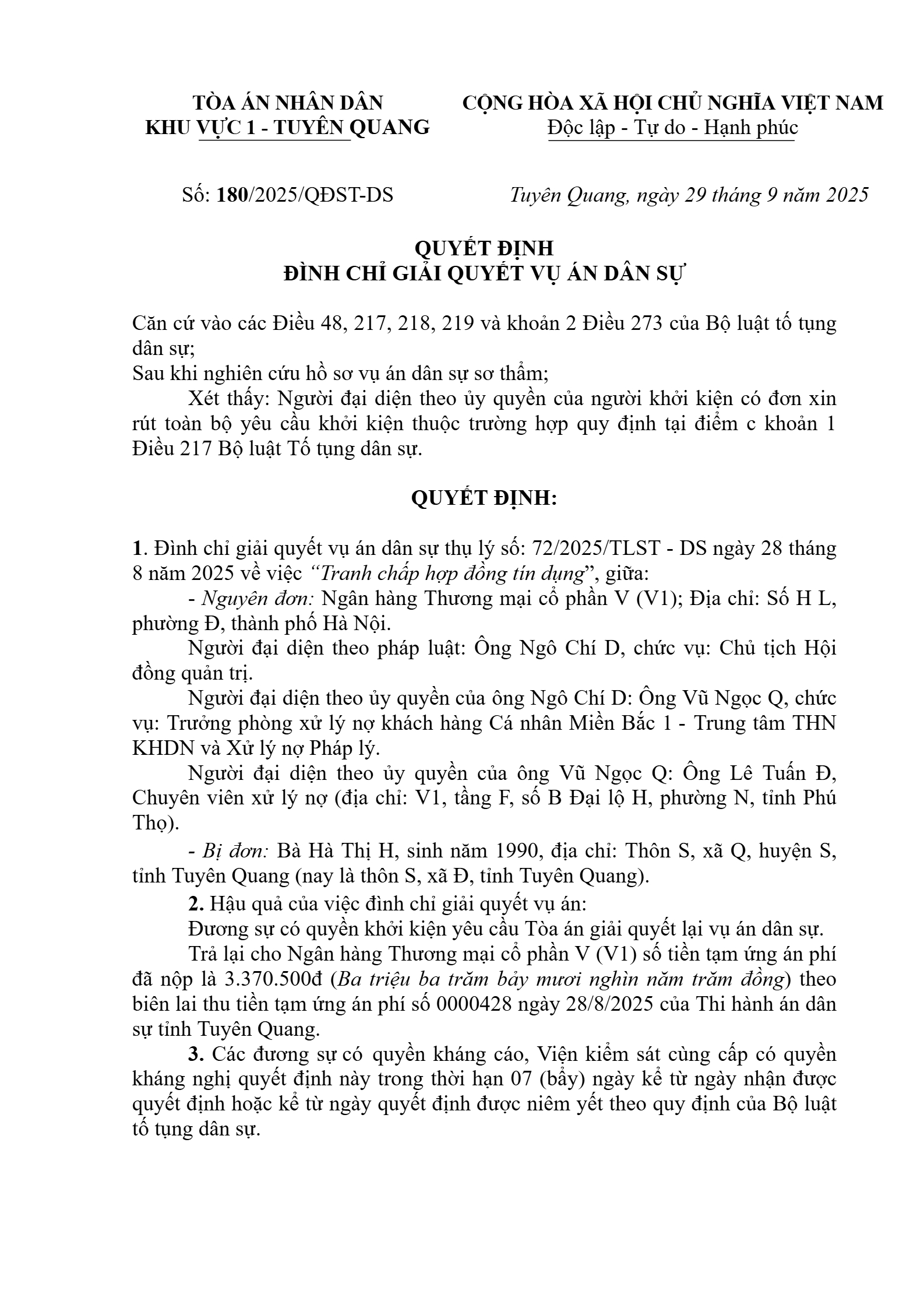Quyết định số 180/2025/QĐST-DS ngày 29/09/2025 của Tòa án nhân dân khu vực 1 - Tuyên Quang, tỉnh Tuyên Quang về tranh chấp hợp đồng tín dụng