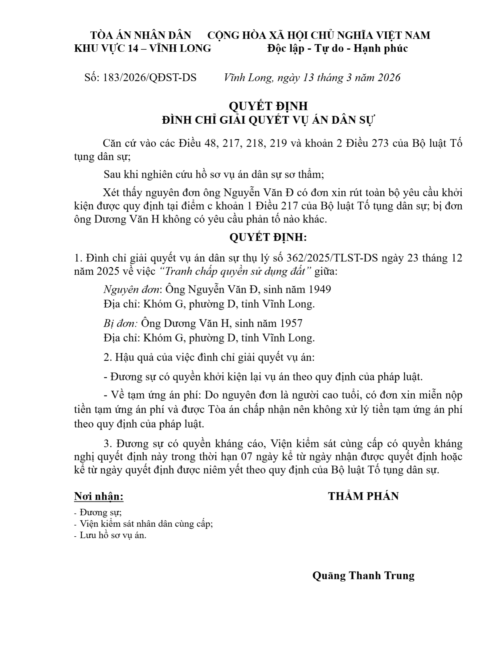 Quyết định số 183/2026/QĐST-DS ngày 13/03/2026 của Tòa án nhân dân khu vực 14 - Vĩnh Long, tỉnh Vĩnh Long về tranh chấp quyền sử dụng đất