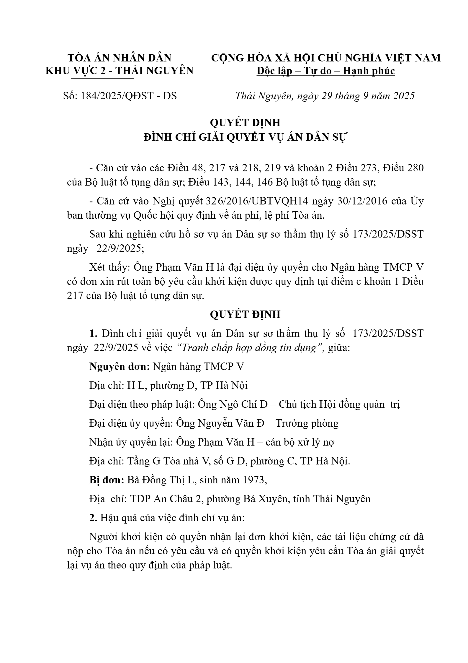 Quyết định số 184/2025/QĐST-DS ngày 29/09/2025 của Tòa án nhân dân khu vực 2 - Thái Nguyên, tỉnh Thái Nguyên về tranh chấp hợp đồng tín dụng