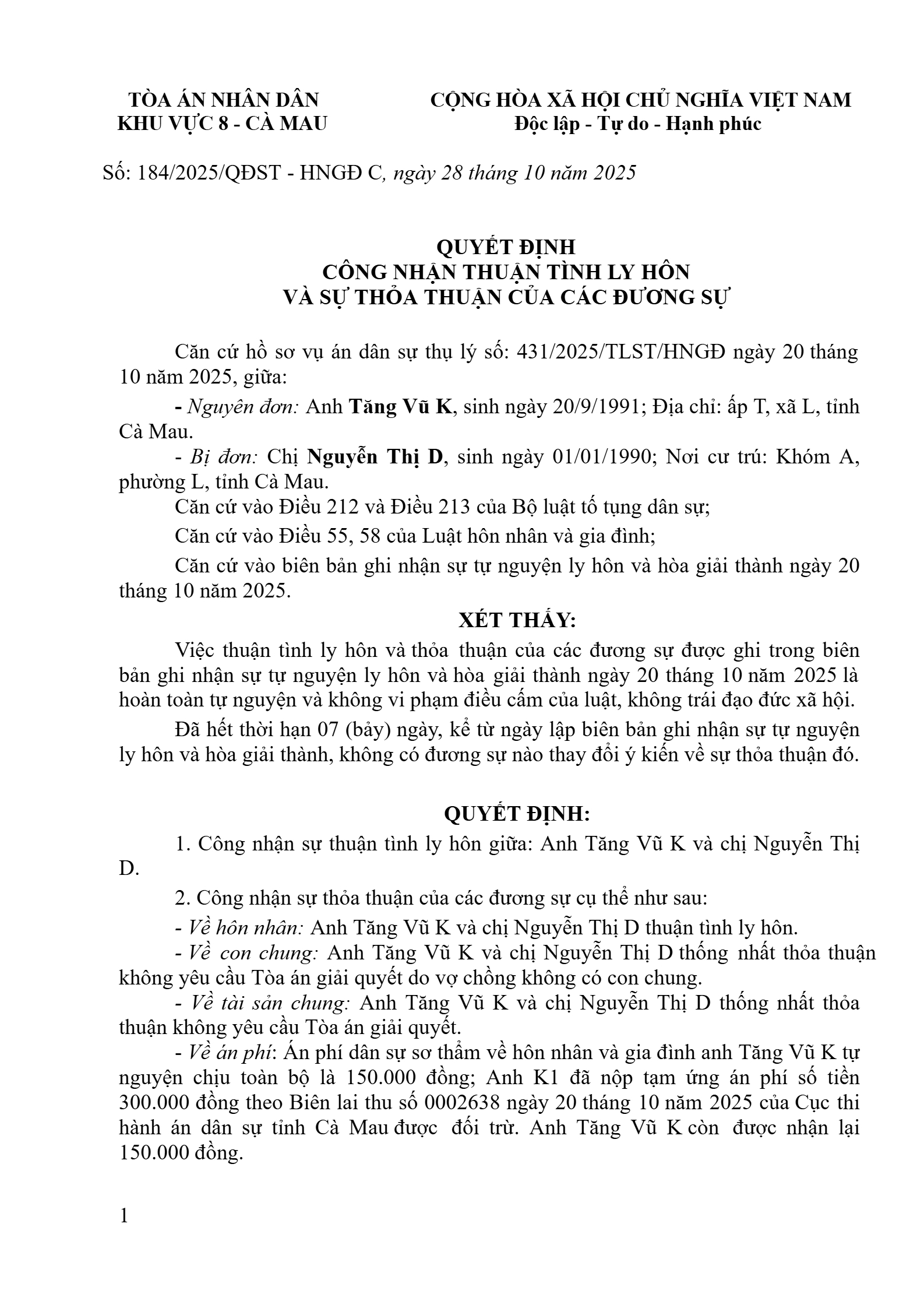 Quyết định số 184/2025/QĐST-HNGĐ ngày 28/10/2025 của Tòa án nhân dân khu vực 8 - Cà Mau, tỉnh Cà Mau về vụ án ly hôn về mâu thuẫn gia đình