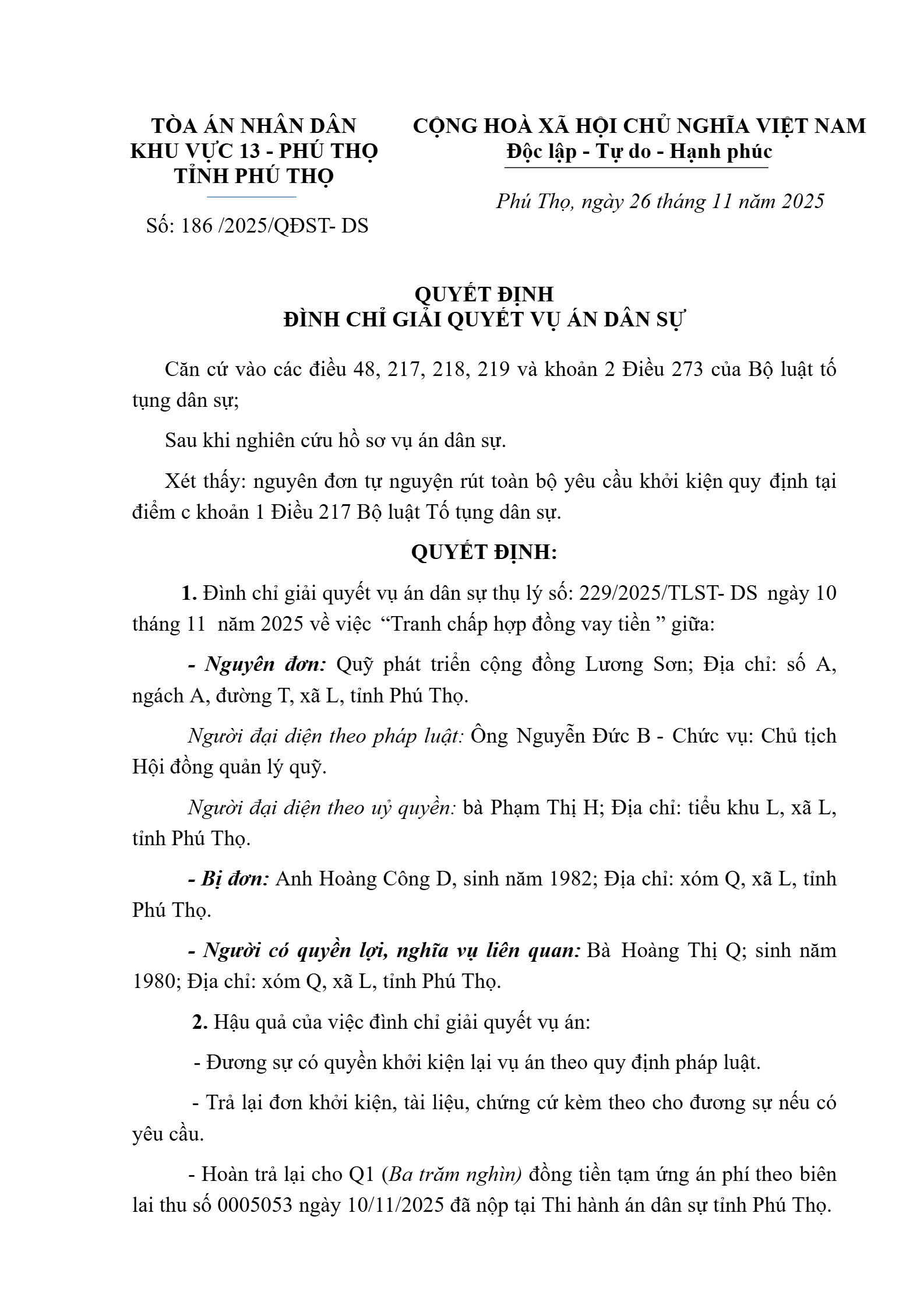 Quyết định số 186/2025/QĐST-DS ngày 26/11/2025 của Tòa án nhân dân khu vực 13 - Phú Thọ, tỉnh Phú Thọ về tranh chấp hợp đồng vay tài sản