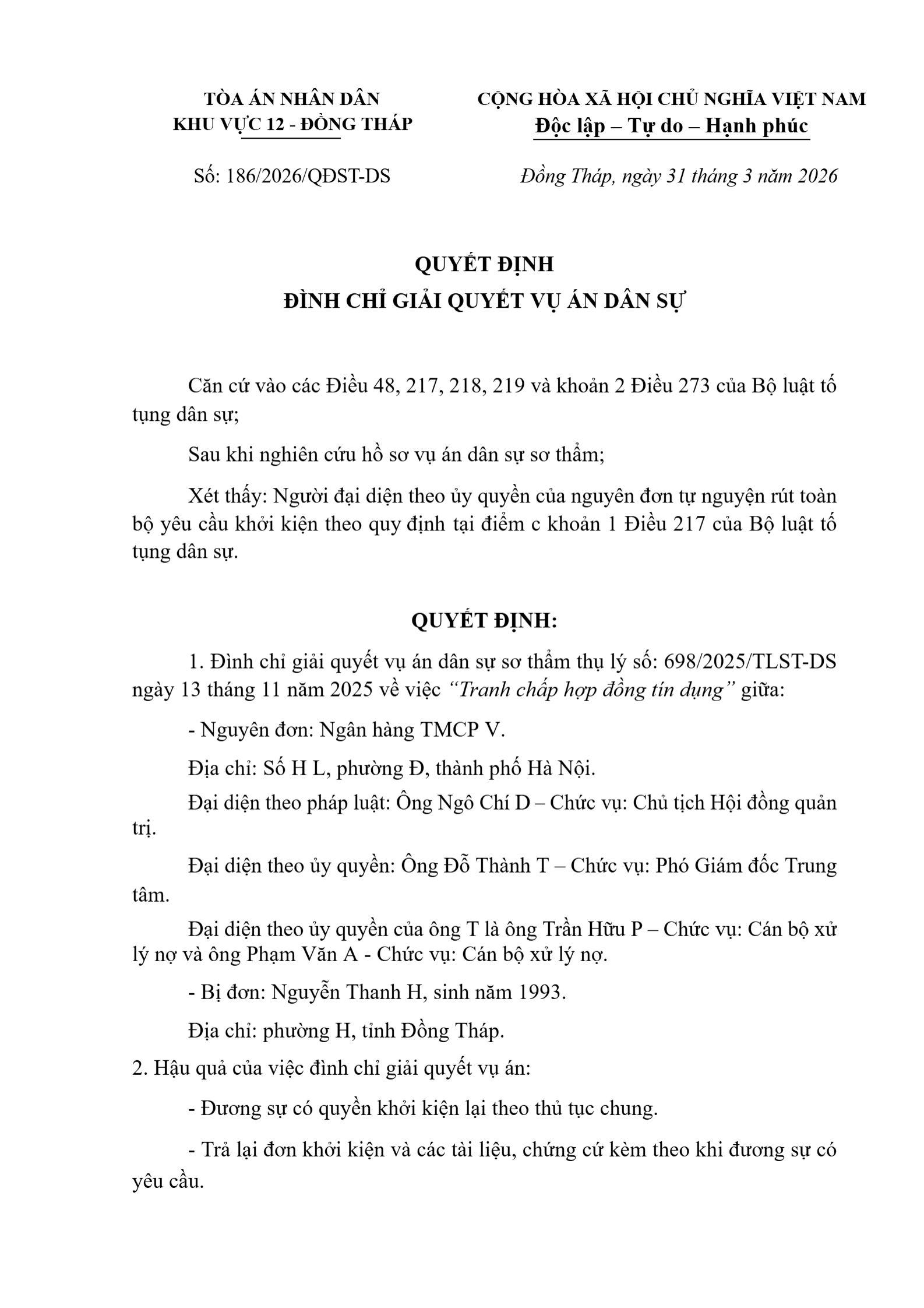 Quyết định số 186/2026/QĐST-DS ngày 31/03/2026 của Tòa án nhân dân khu vực 12 - Đồng Tháp, tỉnh Đồng Tháp về tranh chấp hợp đồng tín dụng