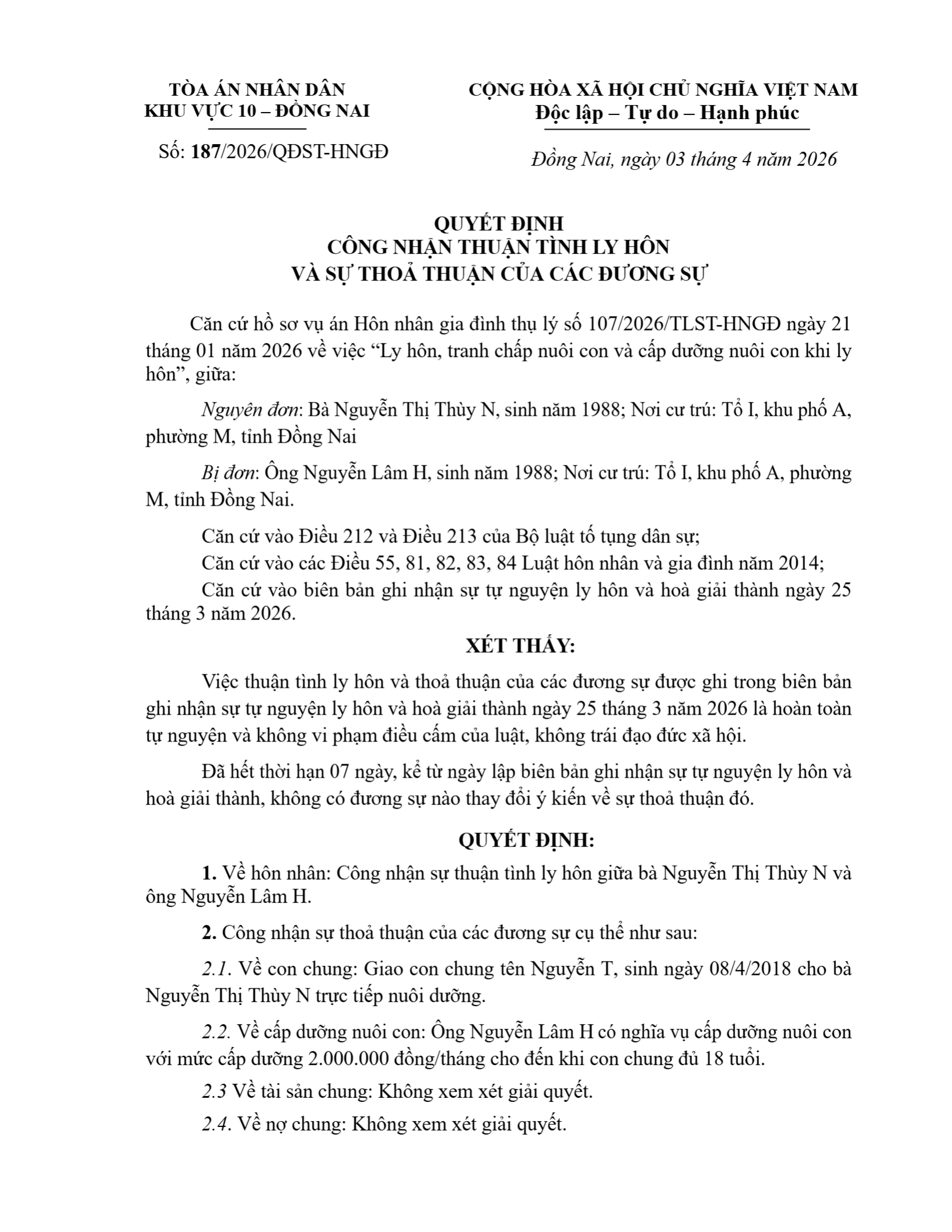 Quyết định số 187/2026/QĐST-HNGĐ ngày 03/04/2026 của Tòa án nhân dân khu vực 10 - Đồng Nai, tỉnh Đồng Nai về vụ án ly hôn về mâu thuẫn gia đình