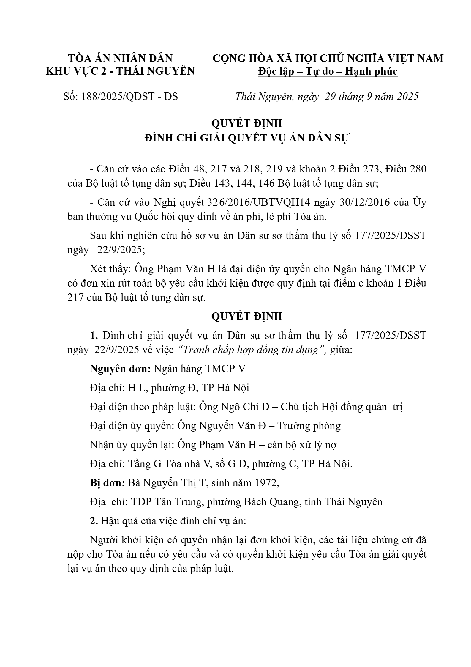 Quyết định số 188/2025/QĐST-DS ngày 29/09/2025 của Tòa án nhân dân khu vực 2 - Thái Nguyên, tỉnh Thái Nguyên về tranh chấp hợp đồng tín dụng