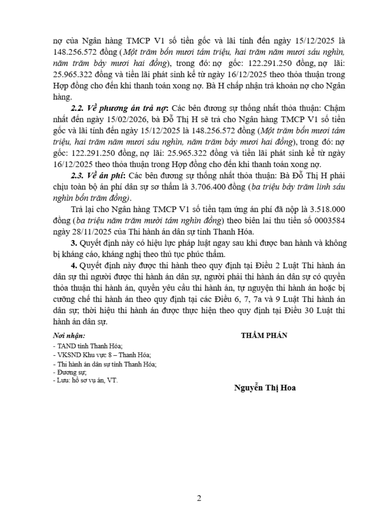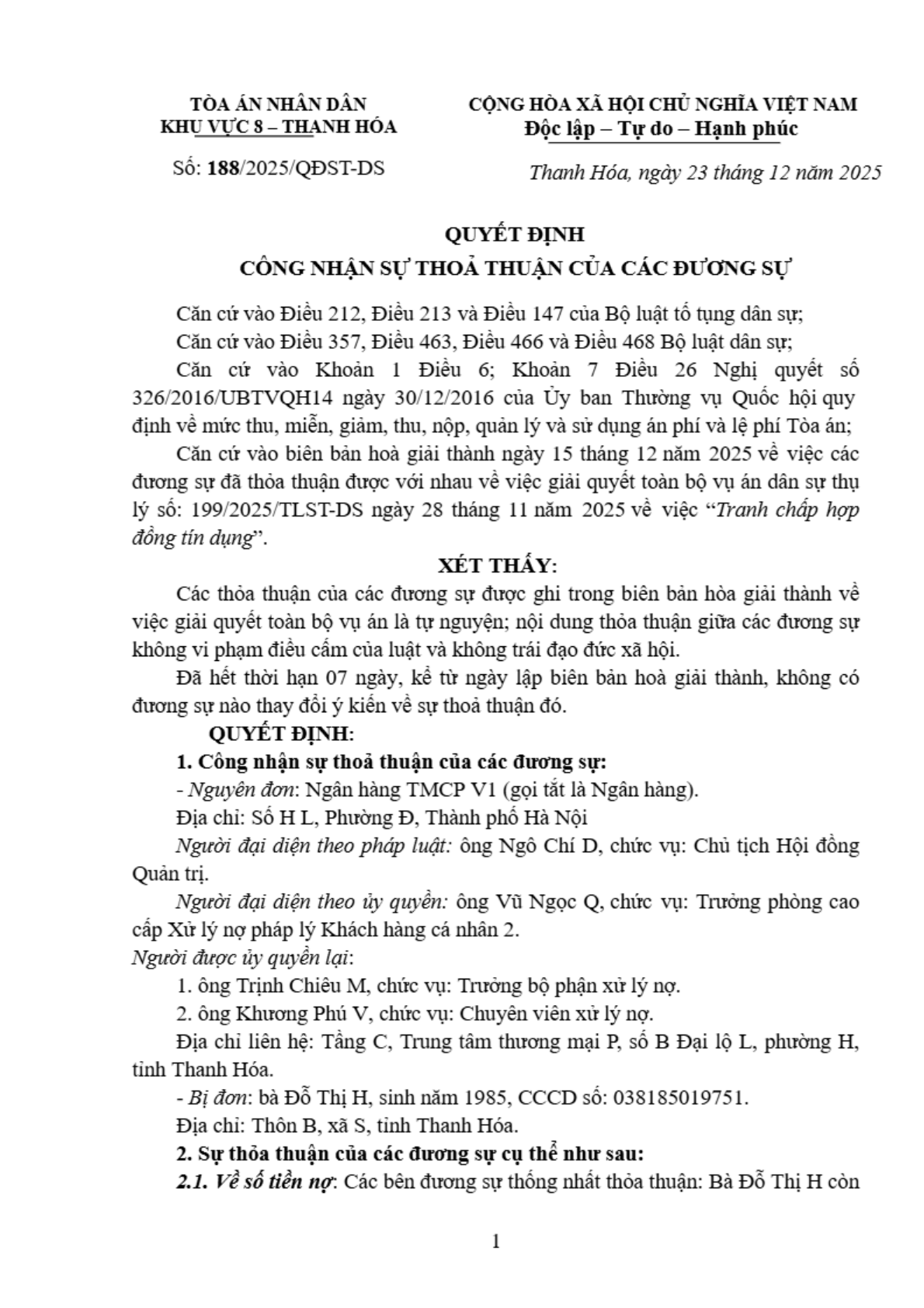 Quyết định số 188/2025/QĐST-DS ngày 23/12/2025 của Tòa án nhân dân khu vực 8 - Thanh Hóa, tỉnh Thanh Hóa về tranh chấp hợp đồng tín dụng