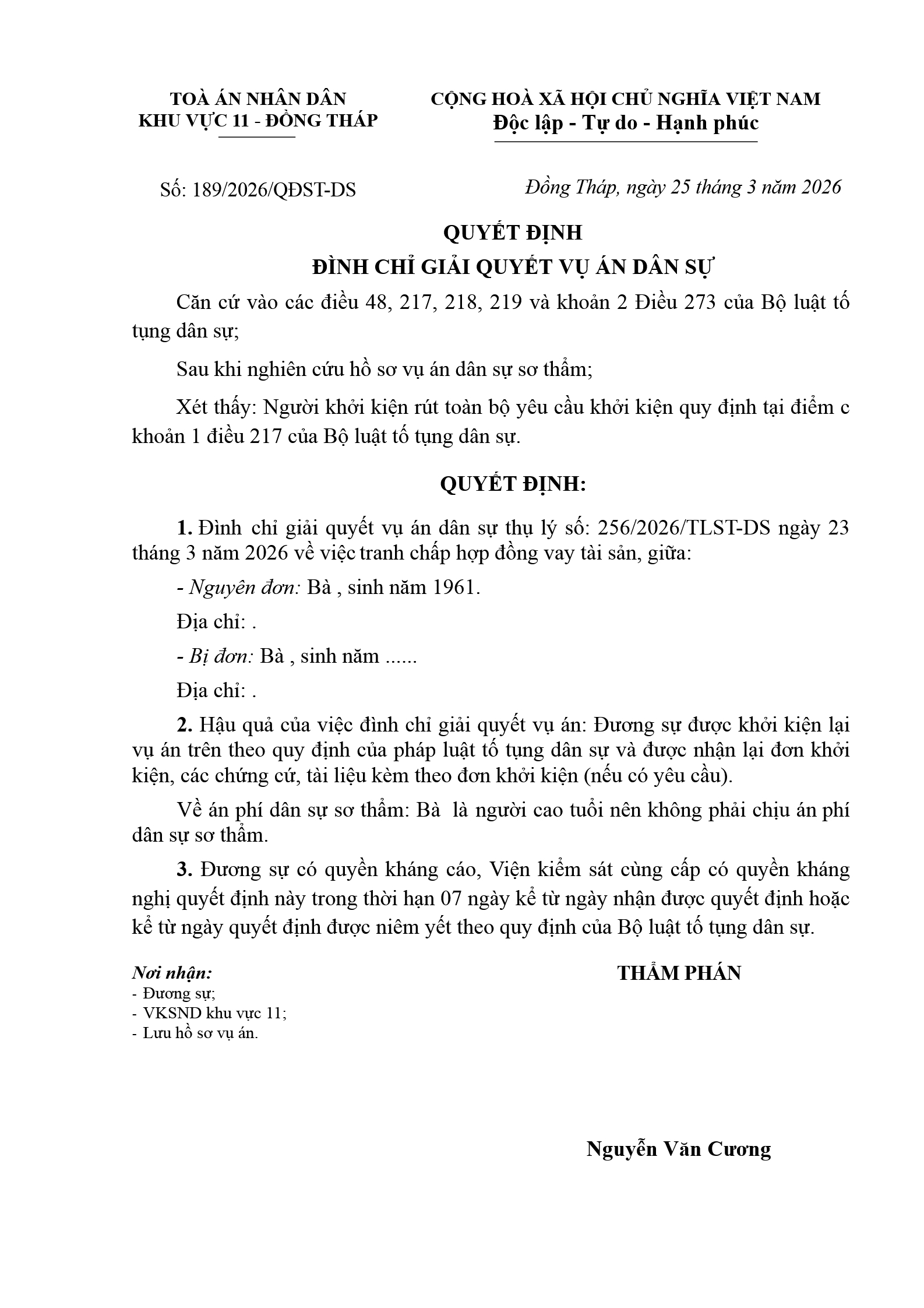Quyết định số 189/2026/QĐST-DS ngày 25/03/2026 của Tòa án nhân dân khu vực 11 - Đồng Tháp, tỉnh Đồng Tháp về tranh chấp hợp đồng vay tài sản