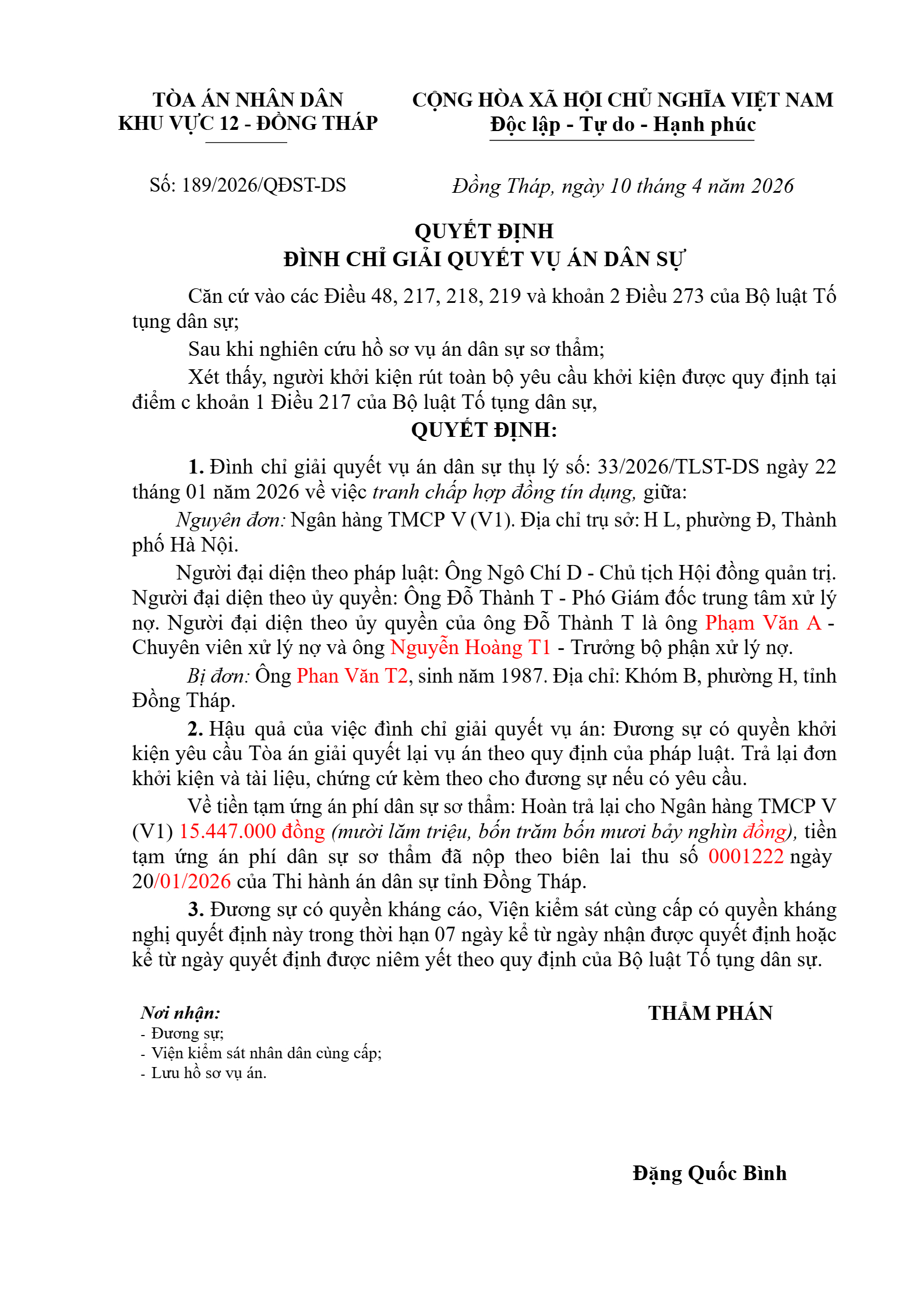 Quyết định số 189/2026/QĐST-DS ngày 10/04/2026 của Tòa án nhân dân khu vực 12 - Đồng Tháp, tỉnh Đồng Tháp về tranh chấp hợp đồng tín dụng
