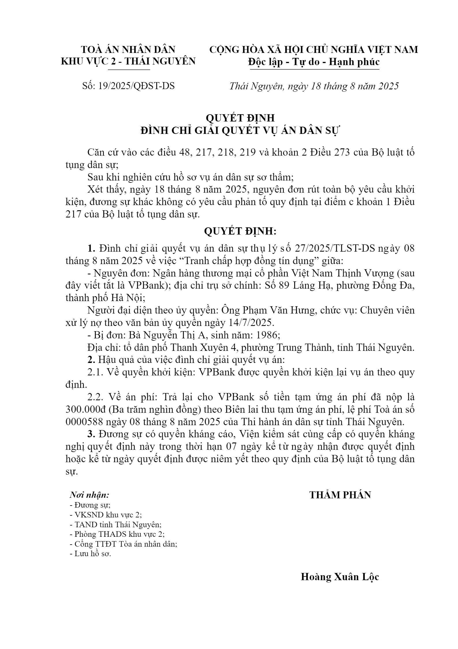 | Số hiệu: | 19/2025/QĐST-DS |