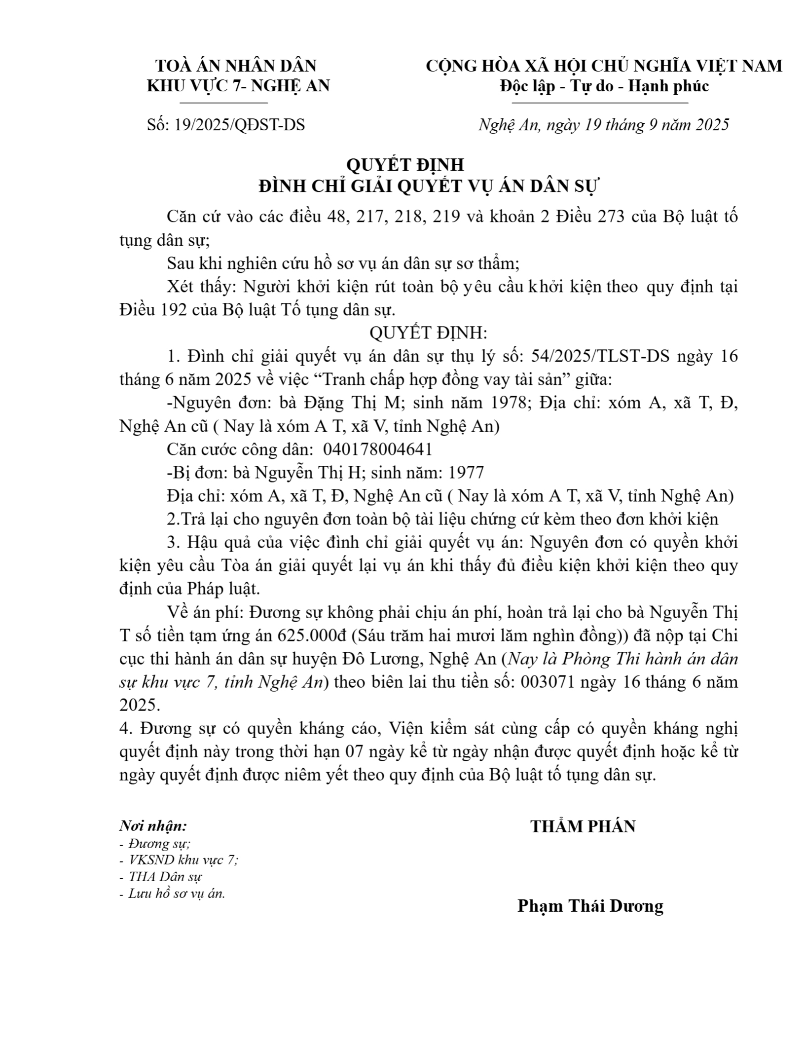 Quyết định số 19/2025/QĐST-DS ngày 19/09/2025 của Tòa án nhân dân khu vực 7 - Nghệ An, tỉnh Nghệ An về tranh chấp hợp đồng vay tài sản