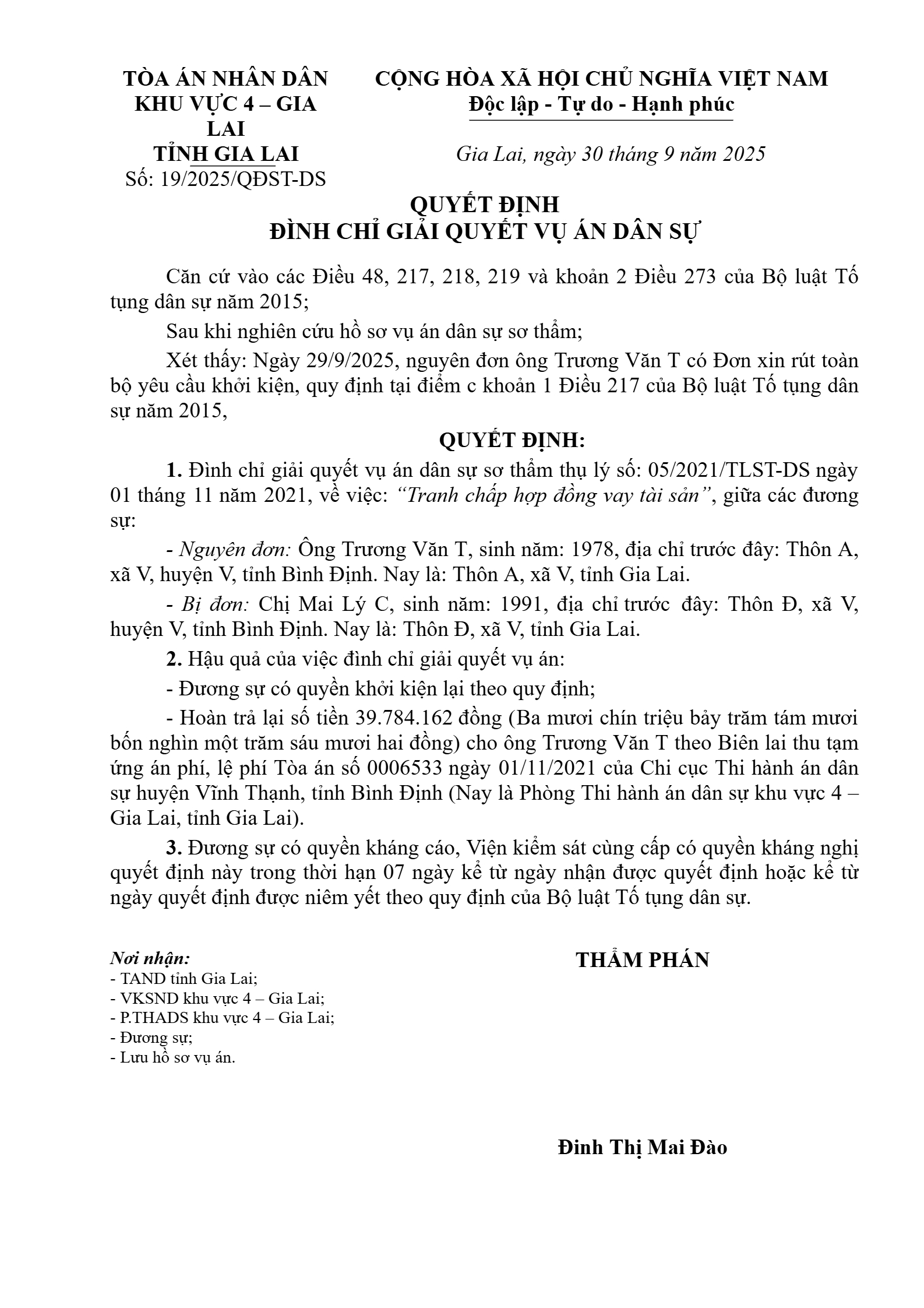 Quyết định số 19/2025/QĐST-DS ngày 30/09/2025 của Tòa án nhân dân khu vực 4 - Gia Lai, tỉnh Gia Lai về tranh chấp hợp đồng vay tài sản