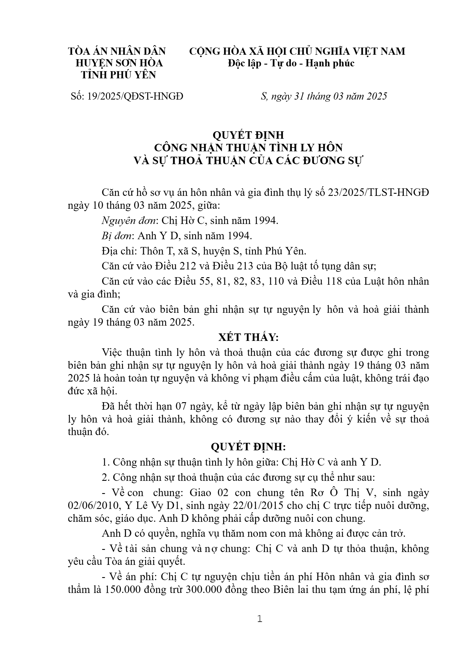 Quyết định số 19/2025/QĐST-HNGĐ ngày 31/03/2025 của TAND huyện Sơn Hòa, tỉnh Phú Yên về vụ án ly hôn về mâu thuẫn gia đình