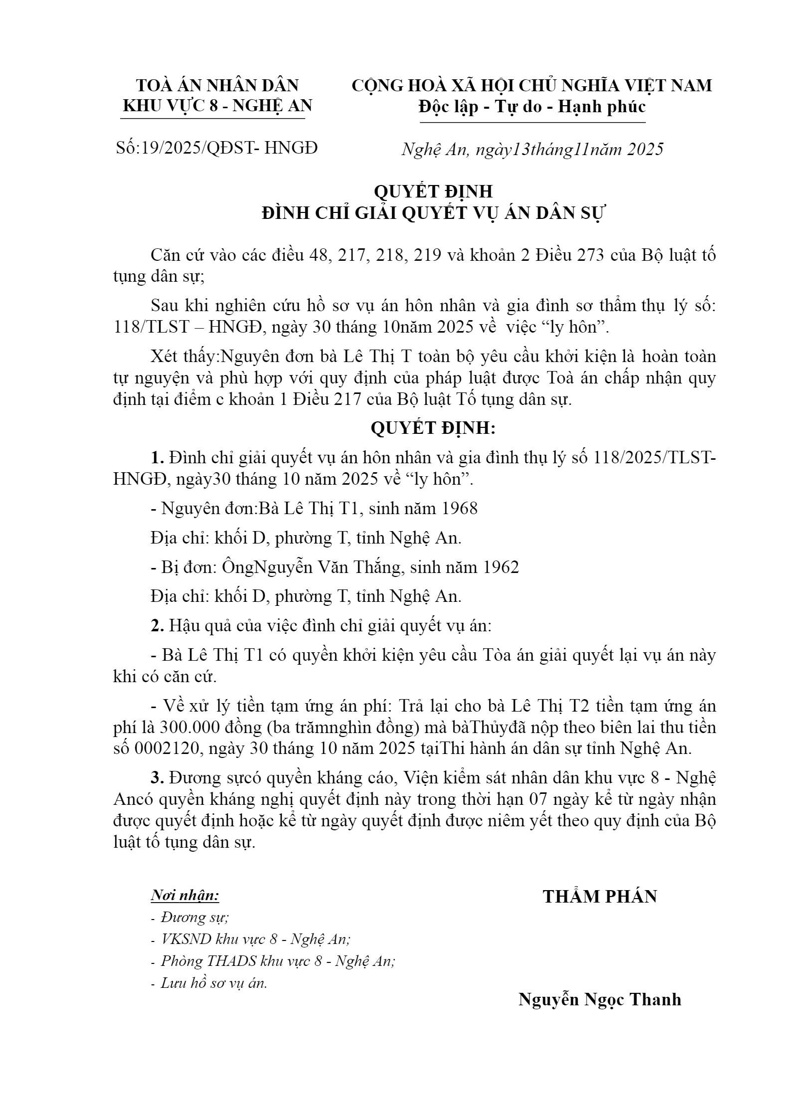 Quyết định số 19/2025/QĐST-HNGĐ ngày 13/11/2025 của Tòa án nhân dân khu vực 8 - Nghệ An, tỉnh Nghệ An về vụ án ly hôn về mâu thuẫn gia đình